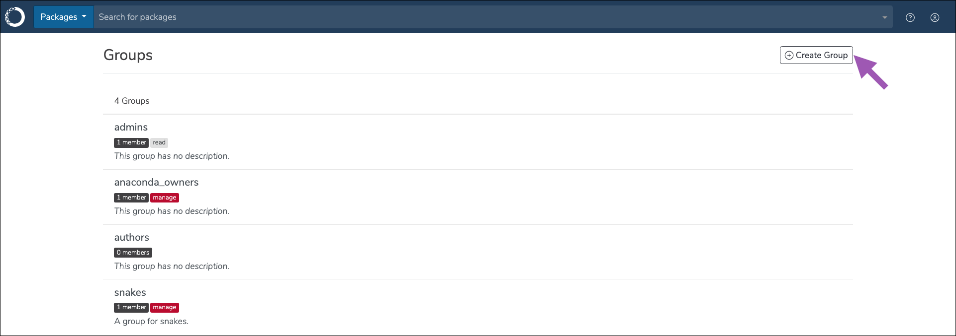 To create a new group, complete the following steps:- Log in to Anaconda Server.