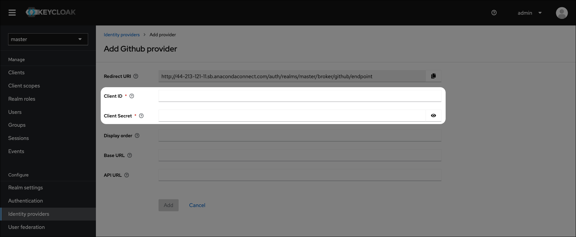 5. Enter the ClientID/Secret from your GitHub OAuth application settings.