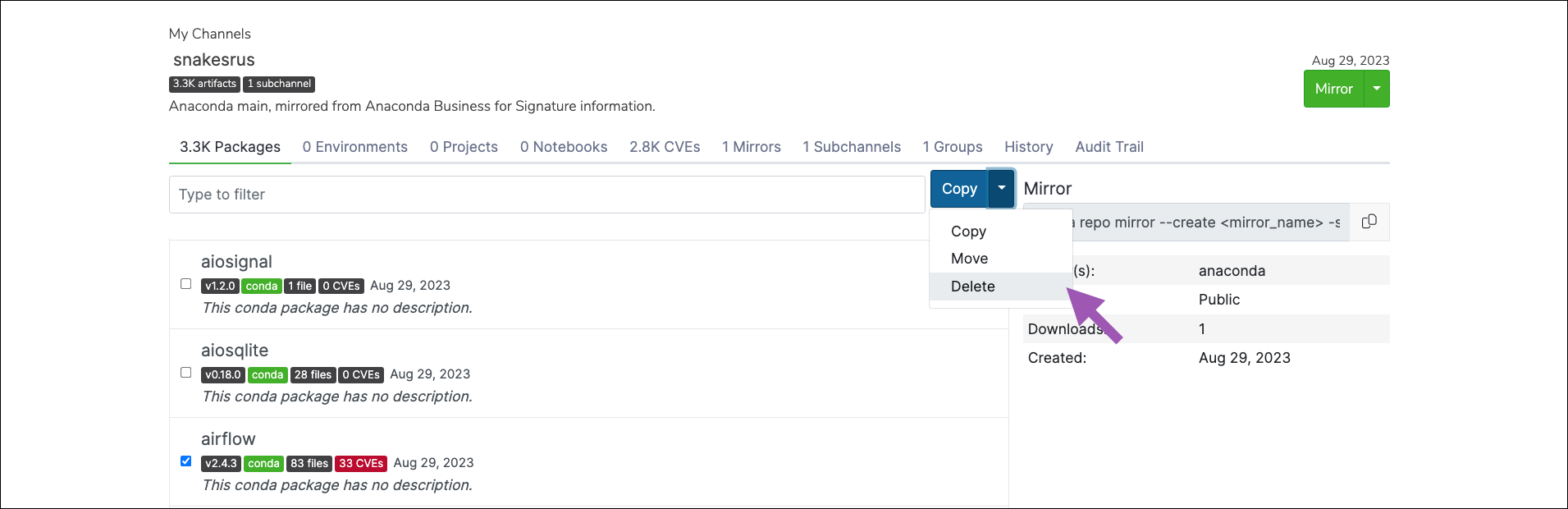 Packages in Anaconda’s repository come with a security signature: a special key value that proves that the package hasn’t been tampered with since going through Anaconda’s curation process. Files within a package that have a signature display a signed tag in the signature column. The actual signature value can be viewed at the bottom of the metadata file.You must mirror your packages using an Anaconda Business channel as a source to view package signatures.