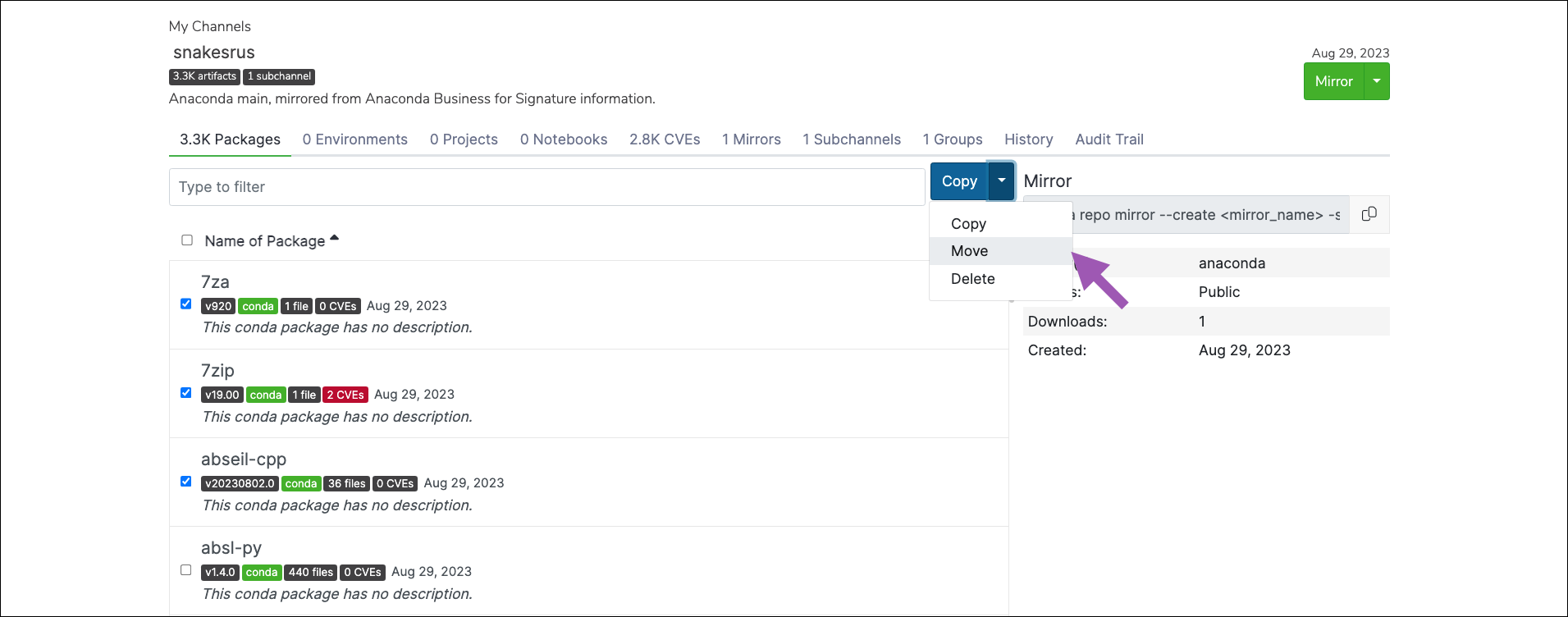 To move a package from one channel or subchannel to another:- From the channel details page, select the packages you want to move from this channel.