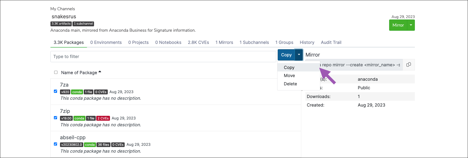 - Open the Copy To: dropdown menu and select a destination channel for your packages.