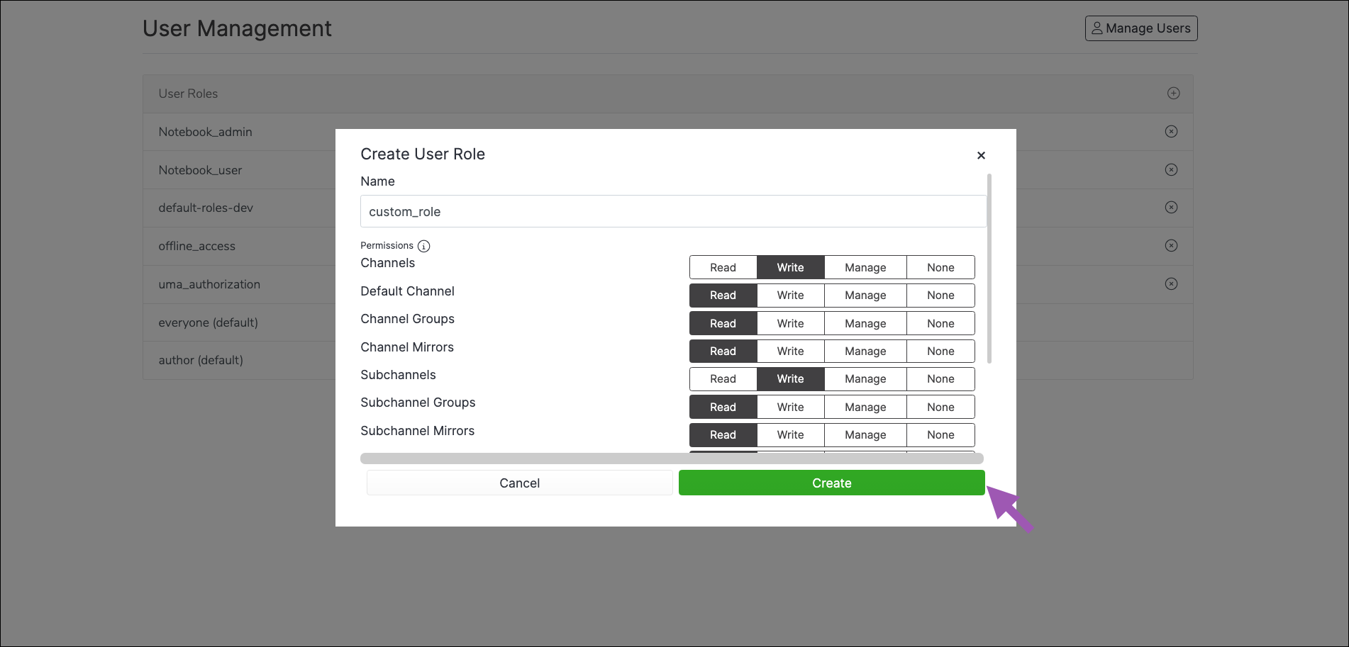 Roles determine the level of access a user has within Anaconda Server. Some preconfigured roles have been embedded into Keycloak to provide users with varying levels of access to the software’s available features. If the default Anaconda roles described here do not suit your use case, you can create a custom role for your users.Permission levels