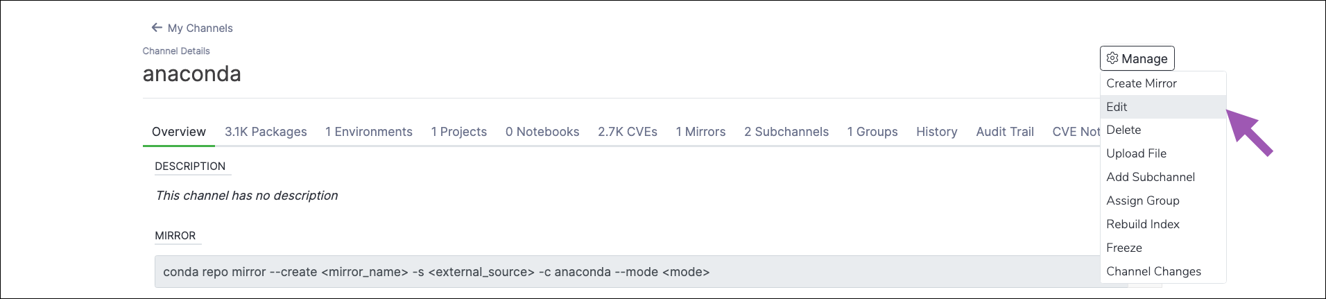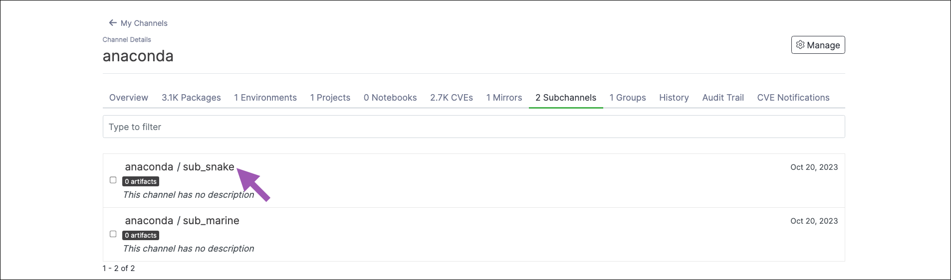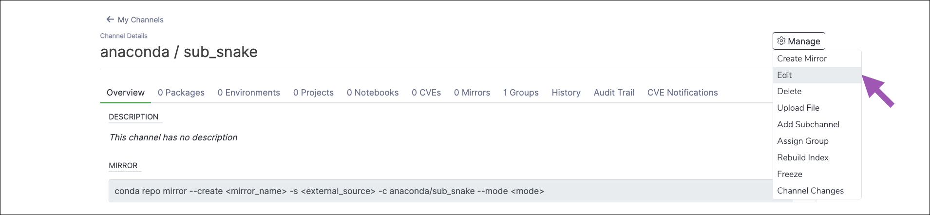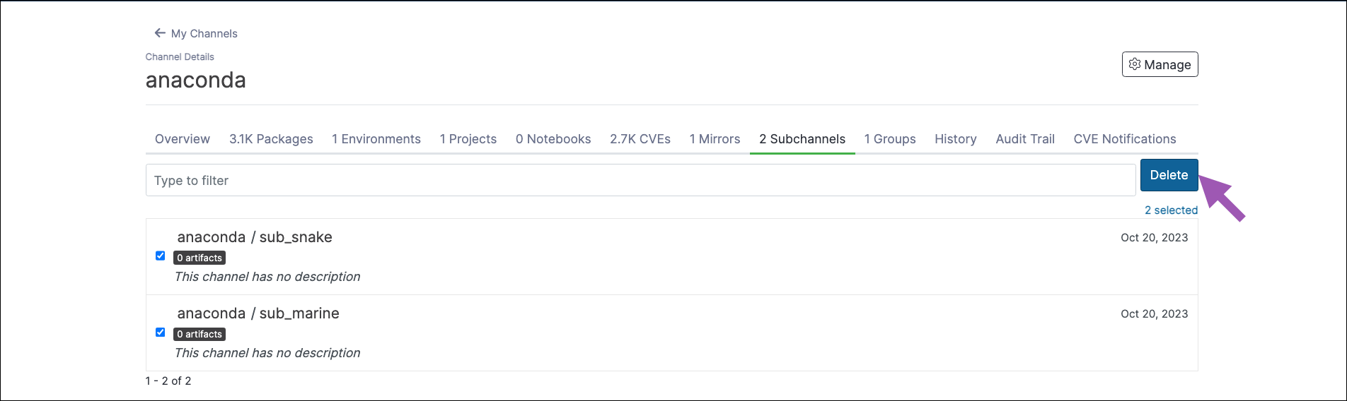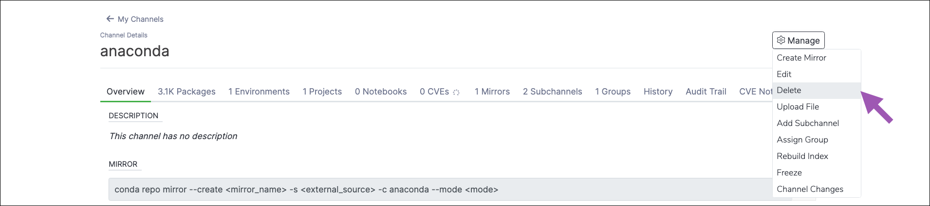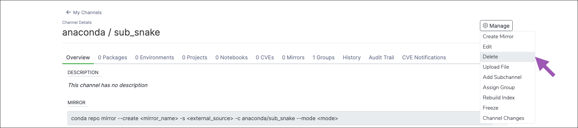 To delete a subchannel in Anaconda Server:- Navigate to the subchannel’s details page.