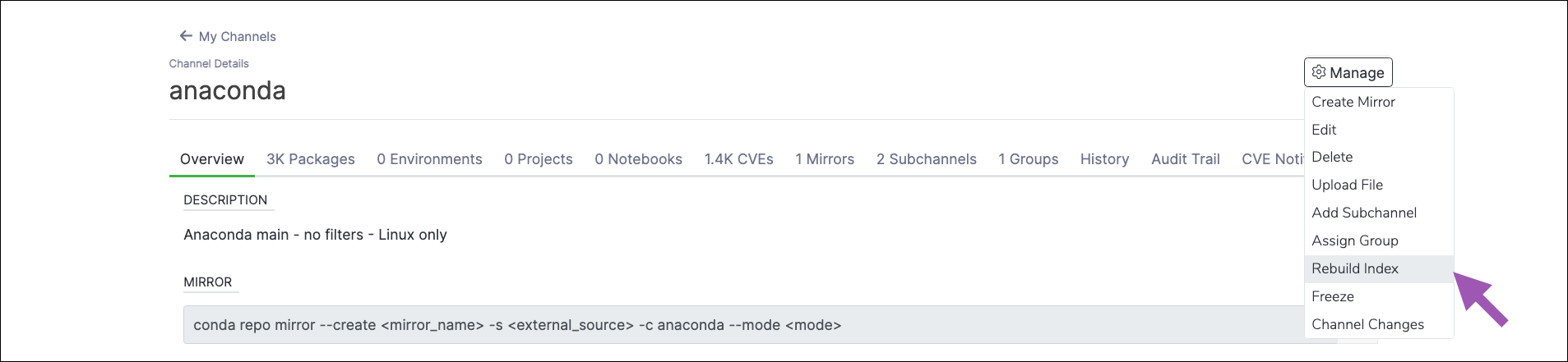 The channel index is automatically rebuilt when certain actions, such as adding or deleting a package, are made. However, if you need to manually rebuild your channel’s index for any reason, follow these steps:- Navigate to the channel’s details page.