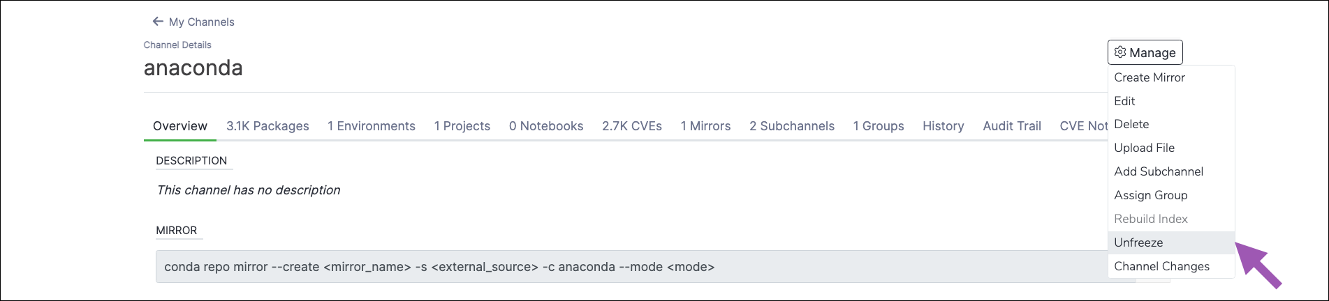 Once the mirror completes, unfreeze the channel to rebuild the channel index. To unfreeze a channel:- Navigate to the channel’s details page.