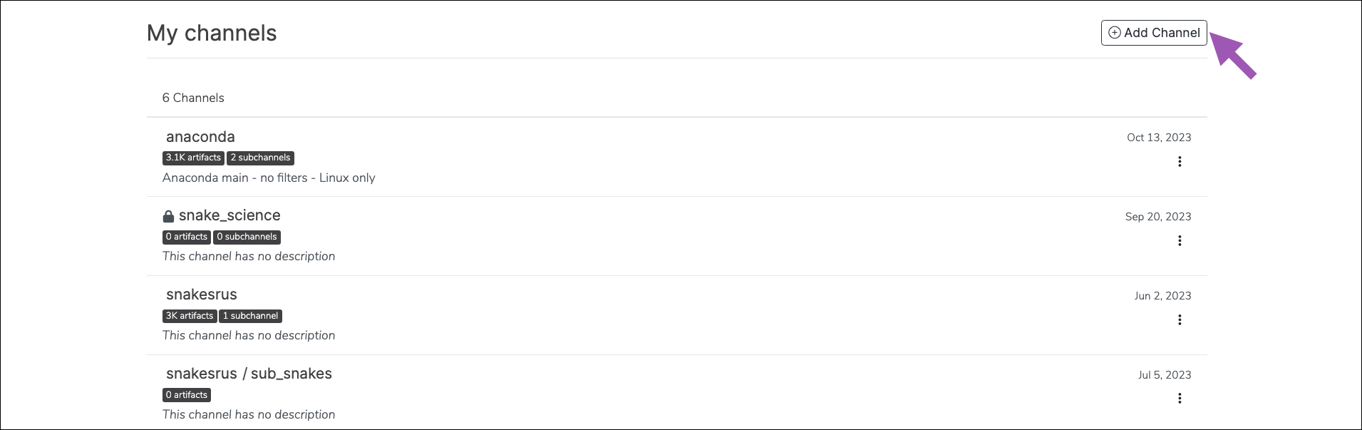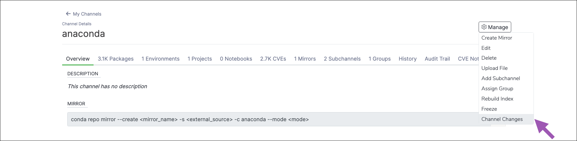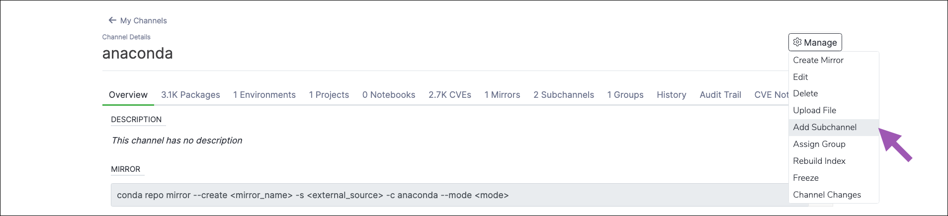 To create a subchannel in Anaconda Server:- Navigate to a channel’s details page.