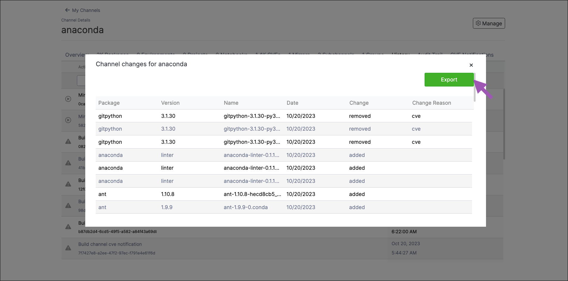 Sometimes, due to newly reported CVEs or an updated CVE score or status, the contents of your channel will change when the mirror performs its scheduled run. A package may become available that was not available previously, or you could discover that a package you’ve been using is removed from your channel entirely! The channel change log shows a record of all package additions and removals within a channel, and provides a reason why the package was added or removed. Packages that are manually moved, copied, or deleted will also appear in the channel change log. To view the channel change log:- Navigate to the channel’s details page.