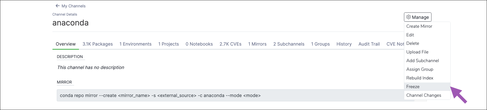 Creating a mirror consumes a large amount of CPU resources. This is because, each time an artifact is added to the channel from the mirror, the channel index is rebuilt to add the artifact to the Packages tab of your channel. If you want to conserve or reduce your CPU usage, you can freeze your channel before creating a mirror to prevent the channel index from being rebuilt every time an artifact is registered from the mirror’s source.Because the channel index is prevented from being built, the Rebuild Index option is disabled while a channel is frozen. Channels and subchannels that are frozen also have their Move and Delete options disabled for packages, projects, environments, and notebooks. In addition, you cannot Copy packages to a channel that is frozen.