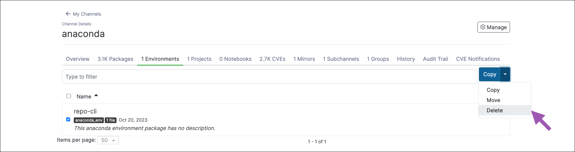 To delete an environment file from a channel or subchannel:- From the channel details page, select the Environments tab.