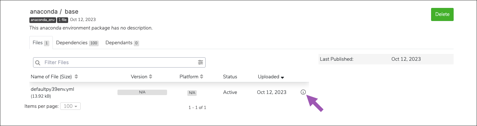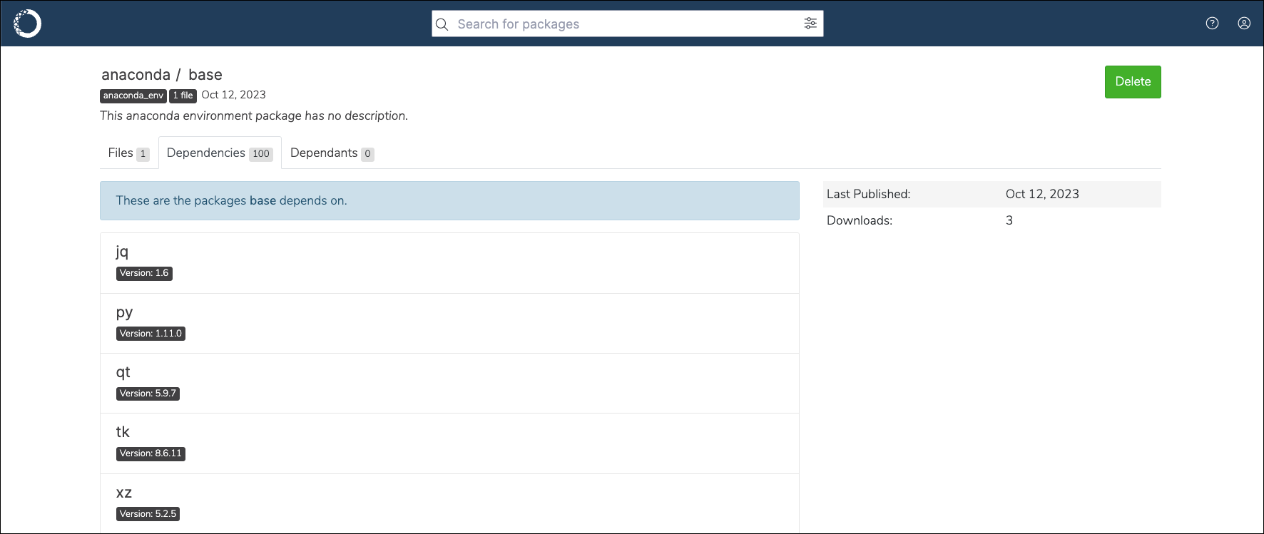 Click on an environment, then select the Dependencies tab to view the packages your environment depends on.