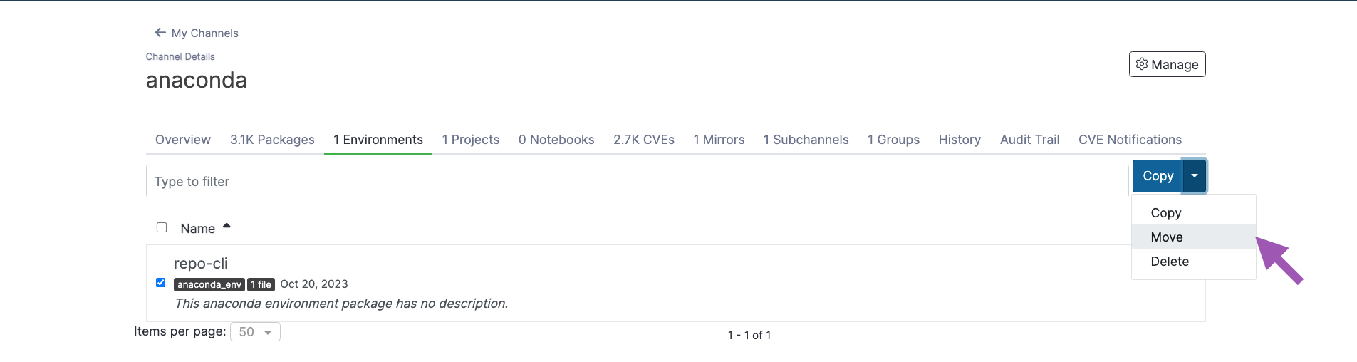 To move an environment file from one channel or subchannel to another:- From the channel details page, select the Environments tab.