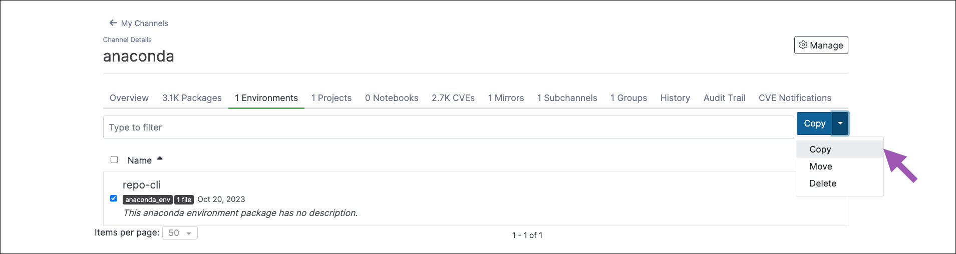 To copy an environment file from one channel or subchannel to another:- From the channel details page, select the Environments tab.