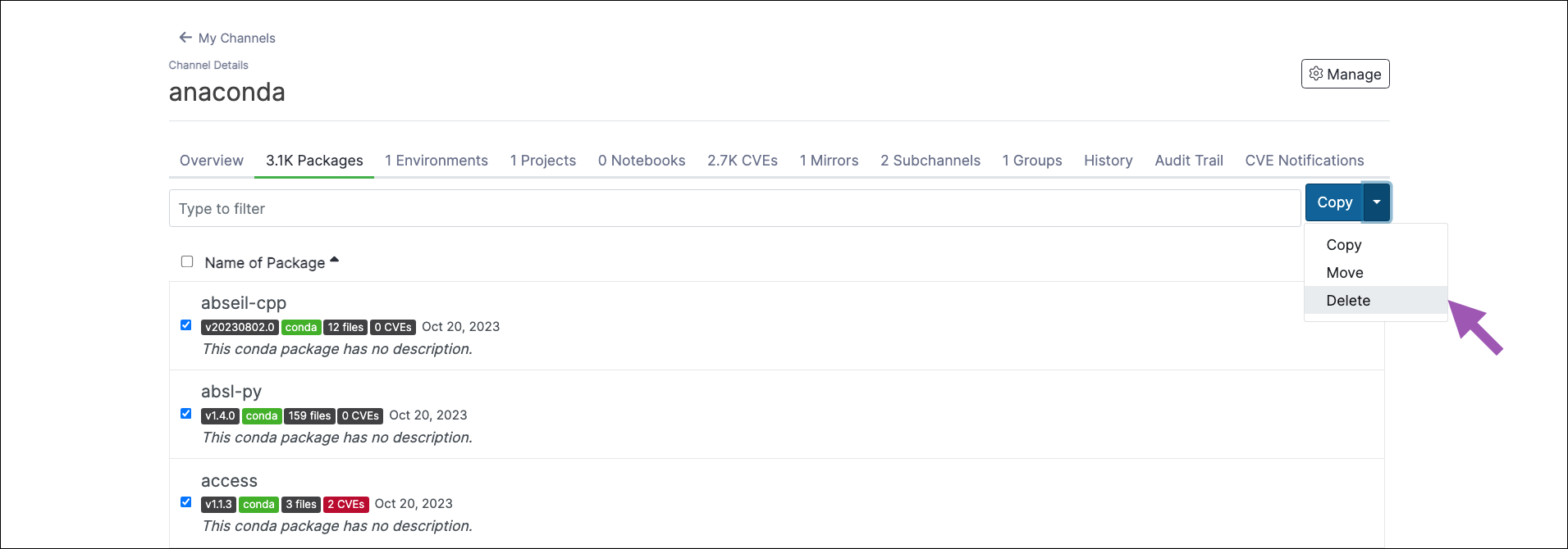 To delete a package from a channel or subchannel:- From the channel details page, select the Packages tab, then select the packages you want to delete from this channel.