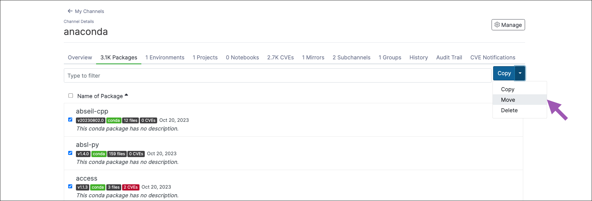 To move a package from one channel or subchannel to another:- From the channel details page, select the Packages tab, then select the packages you want to move from this channel.
