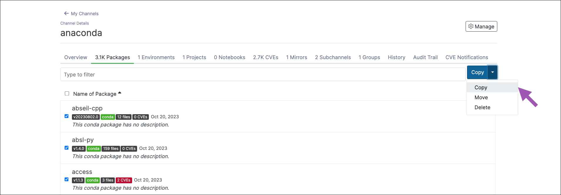 To copy a package from one channel or subchannel to another:- From the channel details page, select the Packages tab, then select the packages you want to copy from this channel.