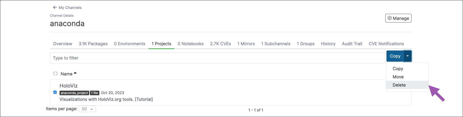 - Select the project you want to delete from this channel.