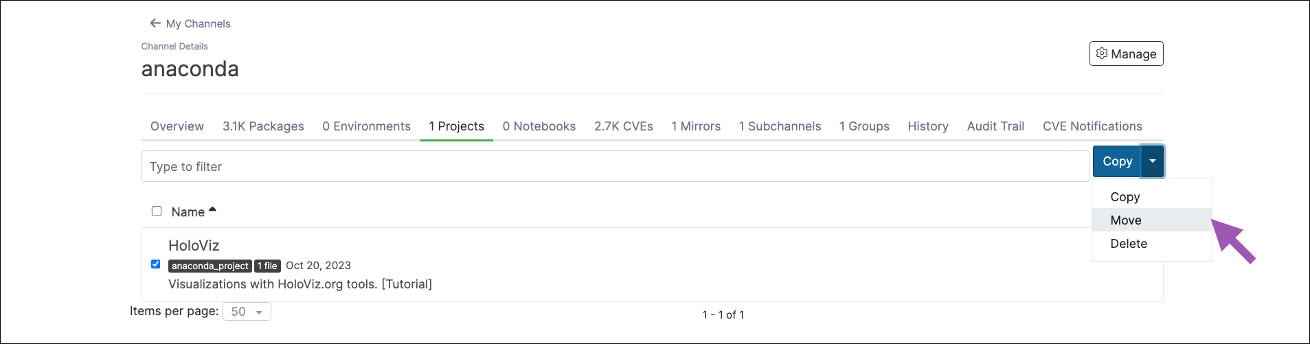 - Select the project you want to move from this channel.