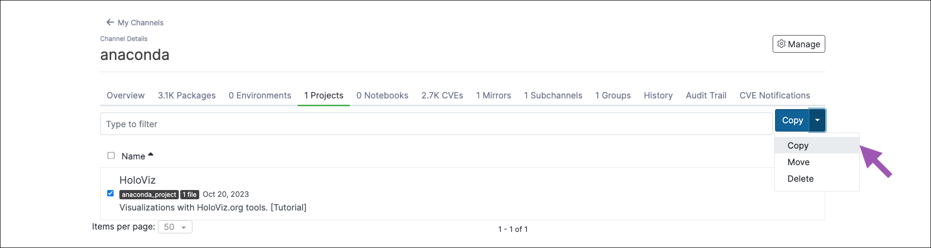 To copy a project from one channel or subchannel to another:- From the channel details page, select the Projects tab.