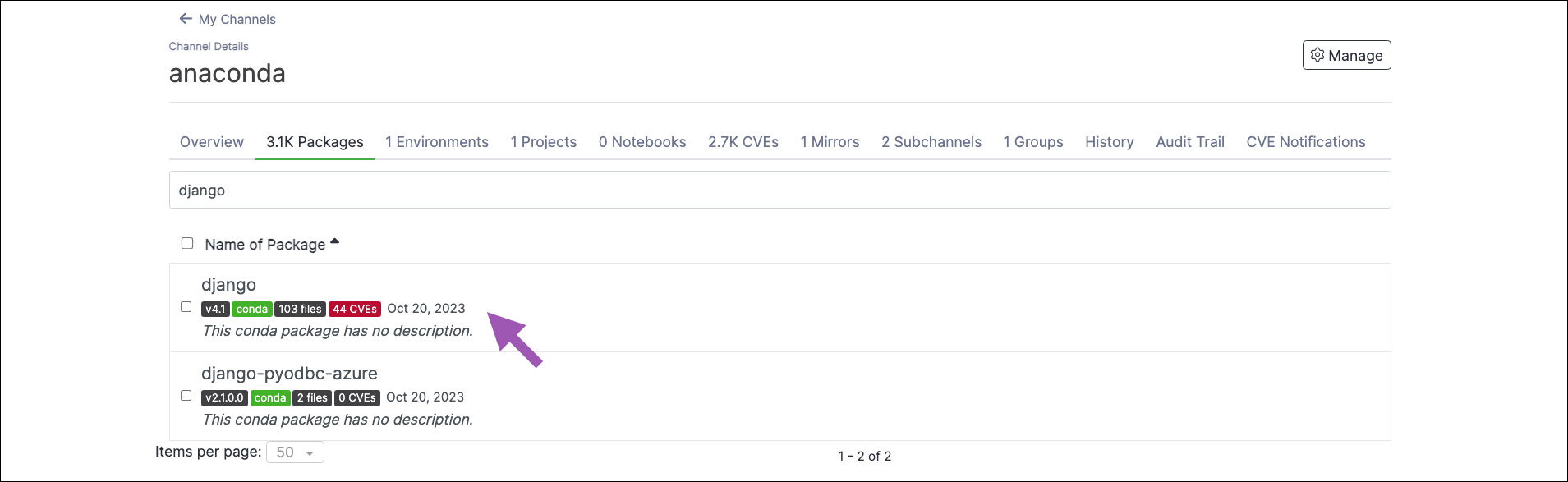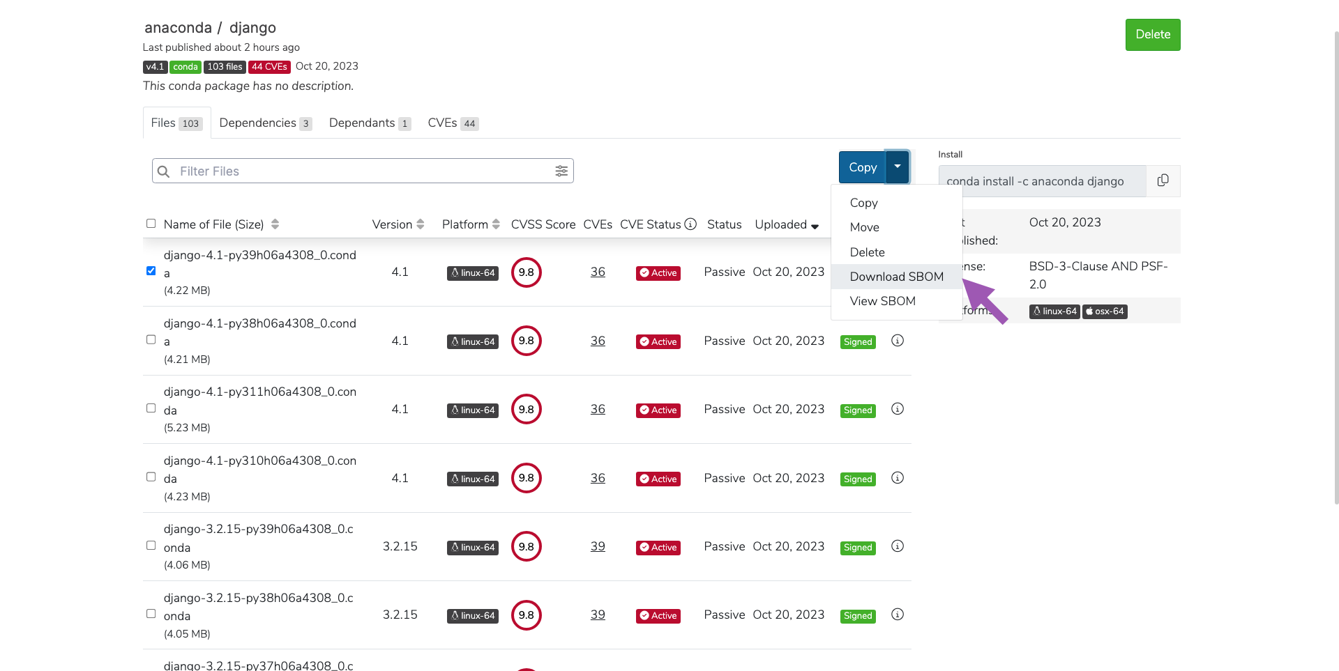 If you purchased a license with SBOM support, a passive SBOM mirror will automatically be created for you on your first login. You can view the status of the mirror’s progress from the All Mirrors view. To view or download the SBOM for a package, follow these steps:- Log in to your instance of Anaconda Server.