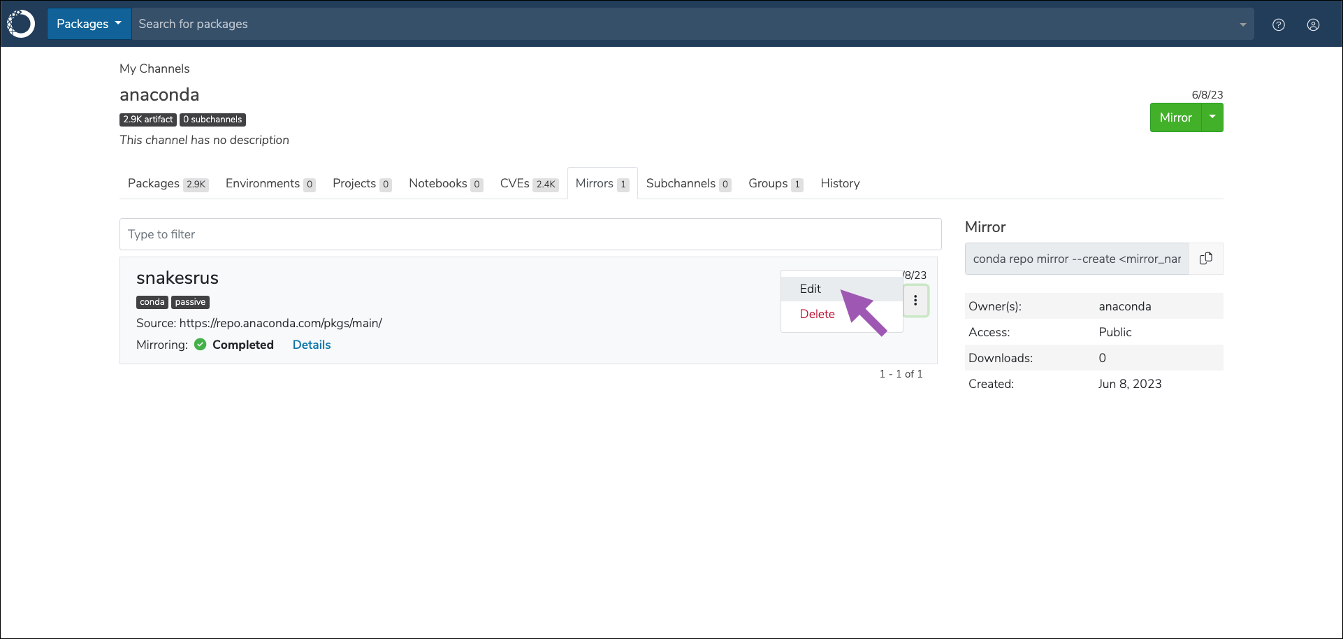 <PKG_NAME>and the requested package will be downloaded from the source at that time.Regardless of which mirror you choose to create, the packages will be the same. Anaconda recommends establishing your mirrors as passive. -