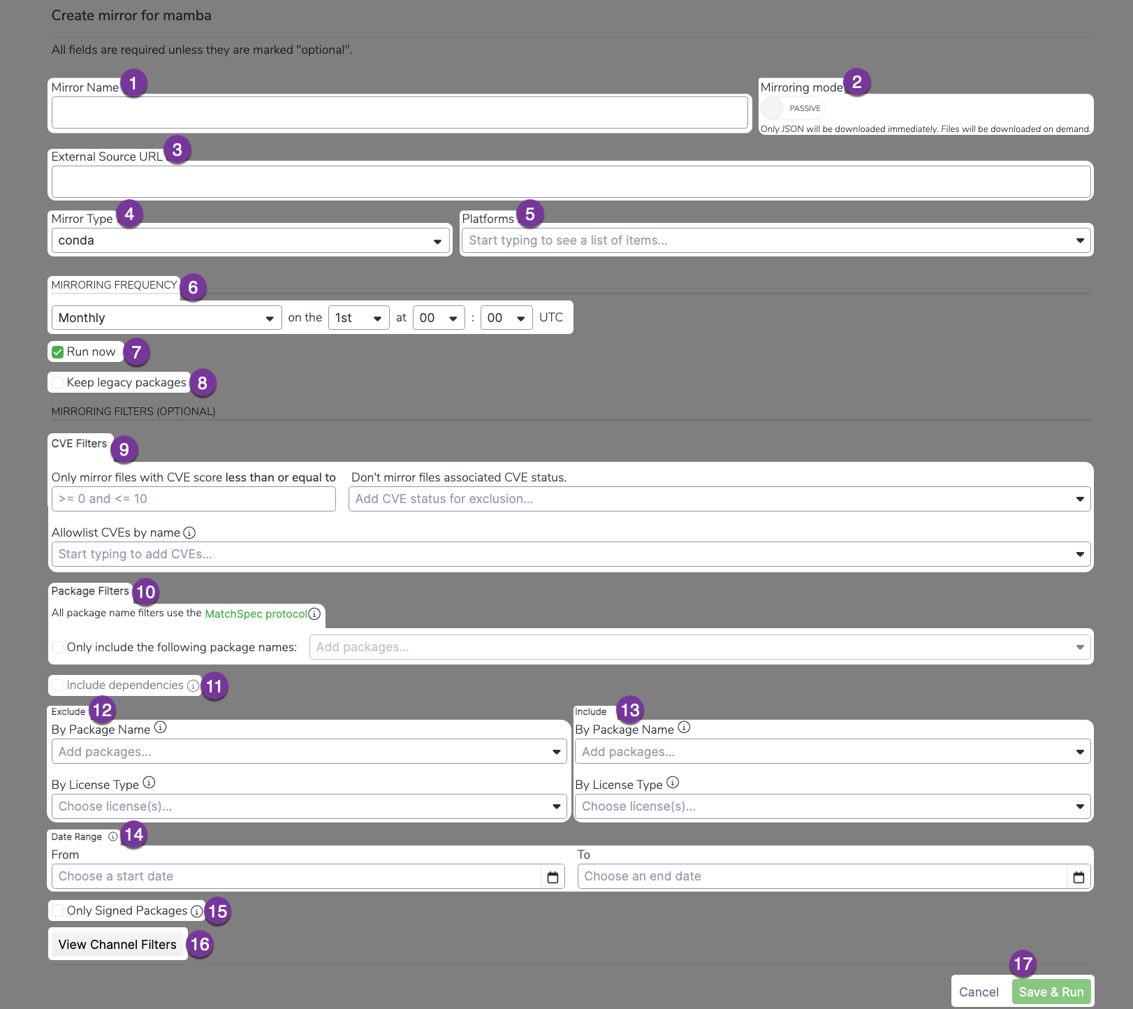 The Create mirror form allows you to set the configurations for your mirror’s allowed packages. Let’s take a look at the different parts of the mirror form and what configurations they control.
