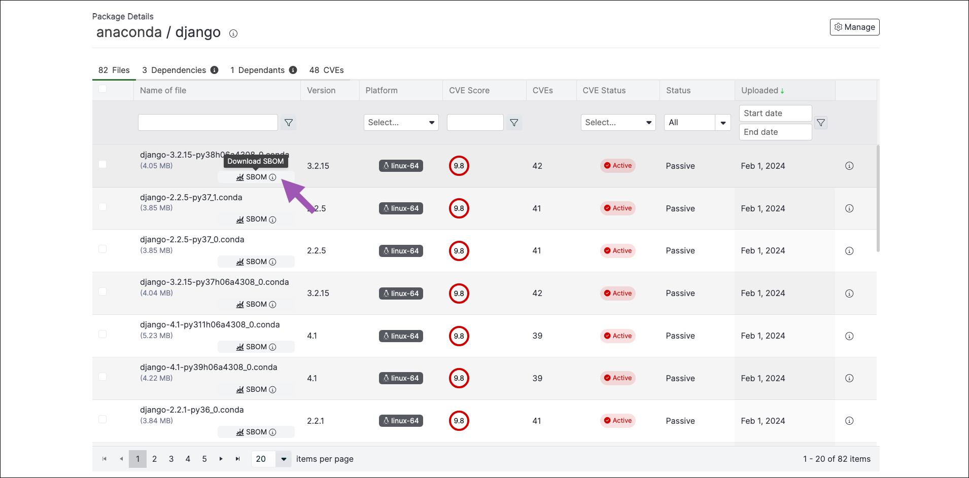 To download an SBOM for a package file:- Log in to your instance of Anaconda Server.