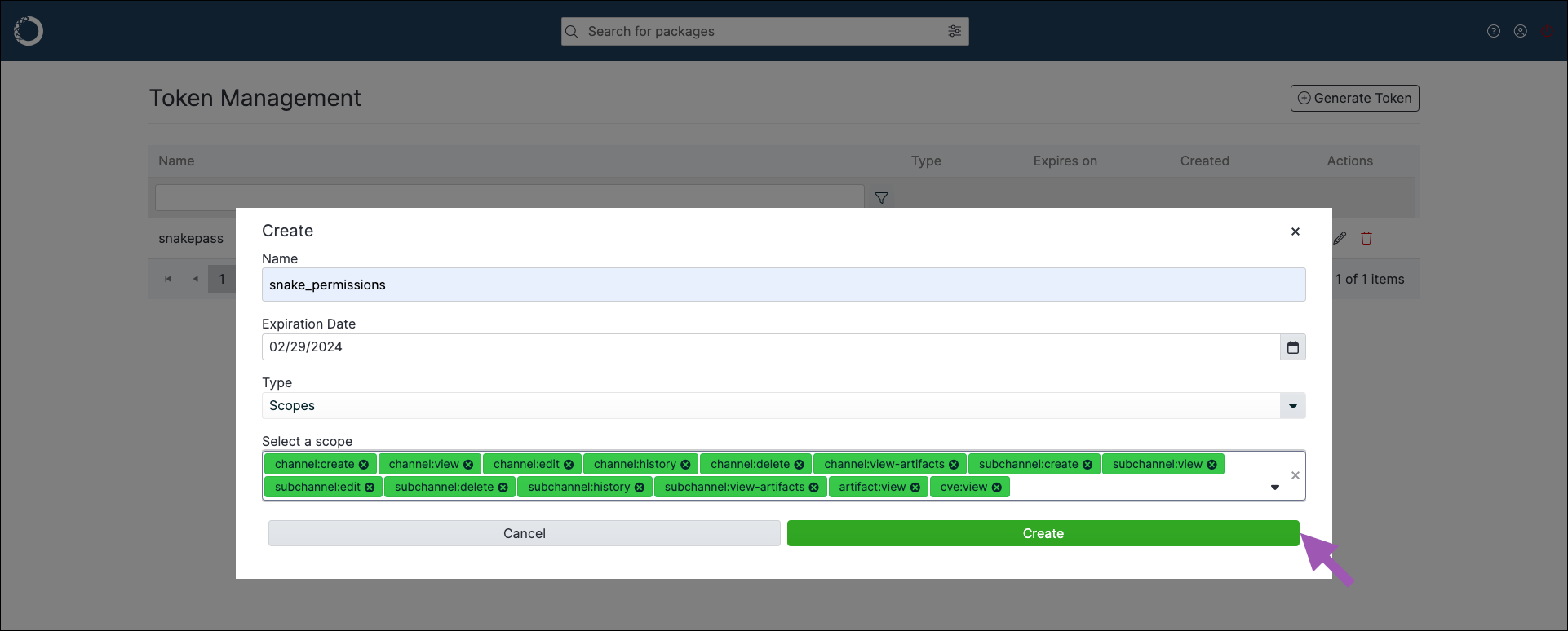 To provide token holders with a custom set of permissions:- Log in to Package Security Manager.