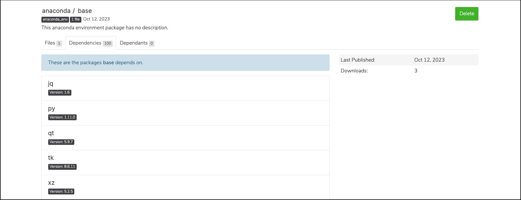 Click on an environment, then select the Dependencies tab to view the packages your environment depends on.
