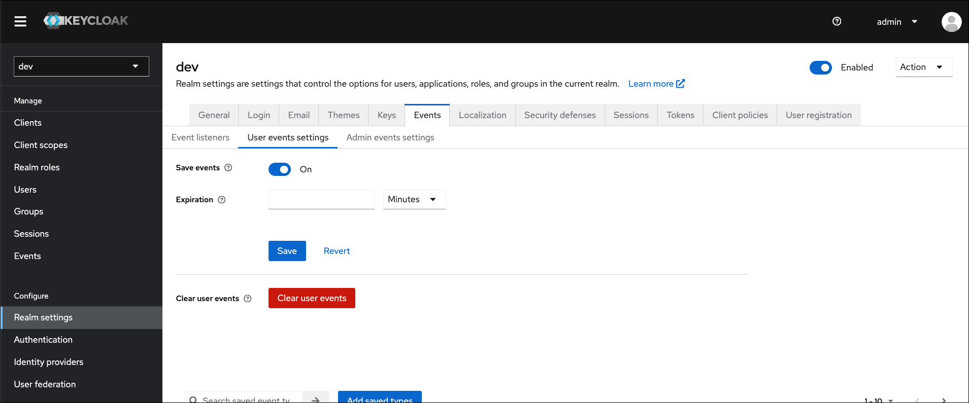 - Select Realm settings from the left-hand navigation, then open the Events tab.