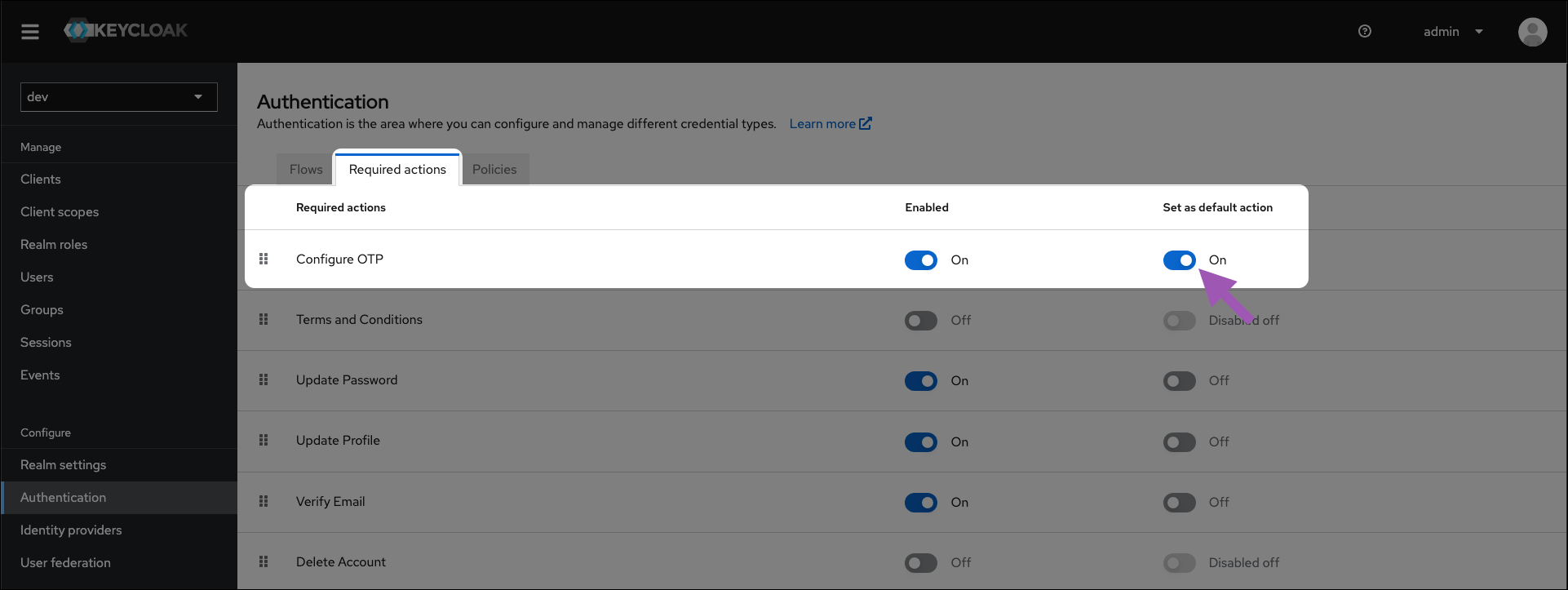 Find Configure OTP in the Required actions column, and toggle Set as default action to