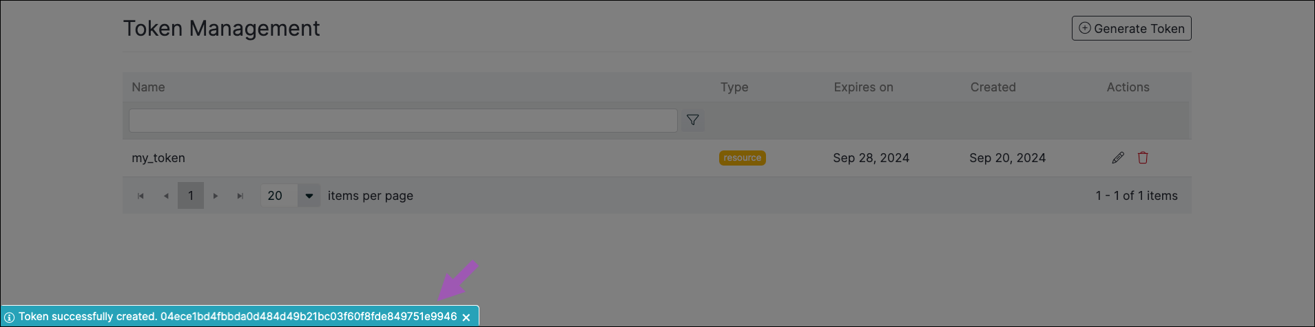 Generated tokens appear in the upper right corner, and will remain visible until you close the notification, or navigate away from the page.Save your token in a secure location! If you lose your token, there is no way to recover the token string. You must issue a new token if you lose your current token.