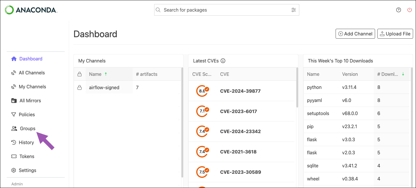 To add channels to a group, complete the following steps:- Log in to Package Security Manager.