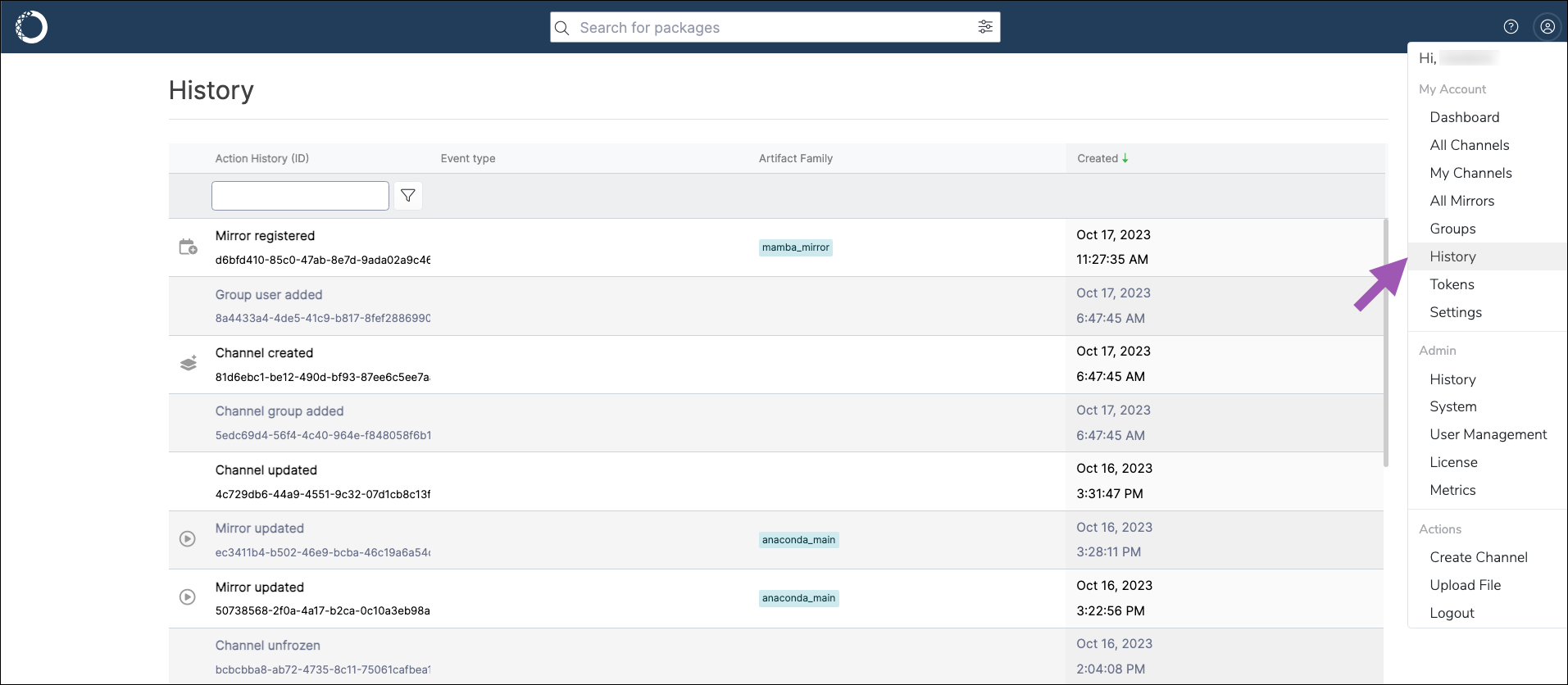 To view your history page, select History from the left-hand navigation.Administrator users have access to a second history log that shows a system-wide history of the same events.