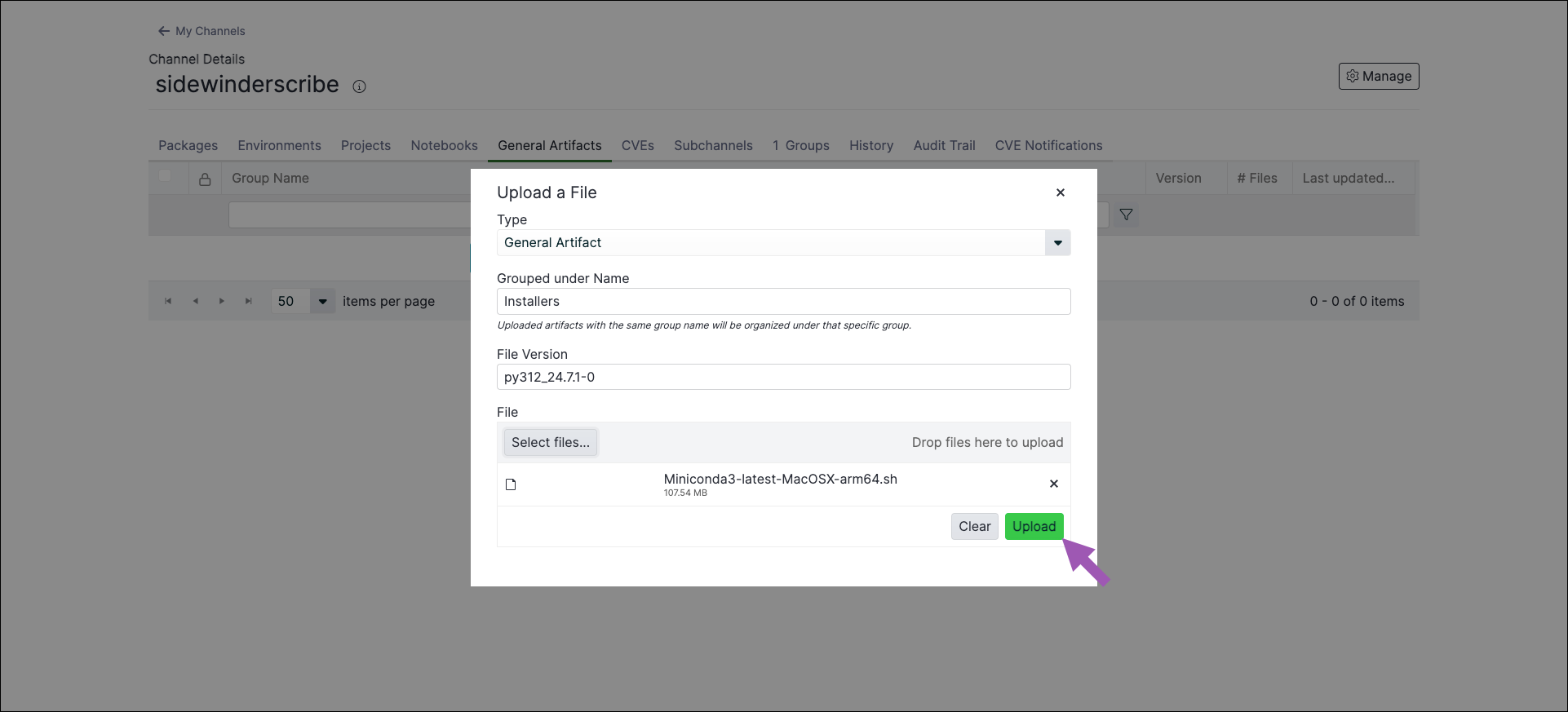 When uploading a general artifact file, you must assign it to an artifact group. In Package Security Manager, the group is considered to be the artifact itself, with the intent that each group contains variations of the same file for different platforms. Using our earlier example, if you want to upload Miniconda installers for distribution, you might create an artifact group calledMiniconda Installers