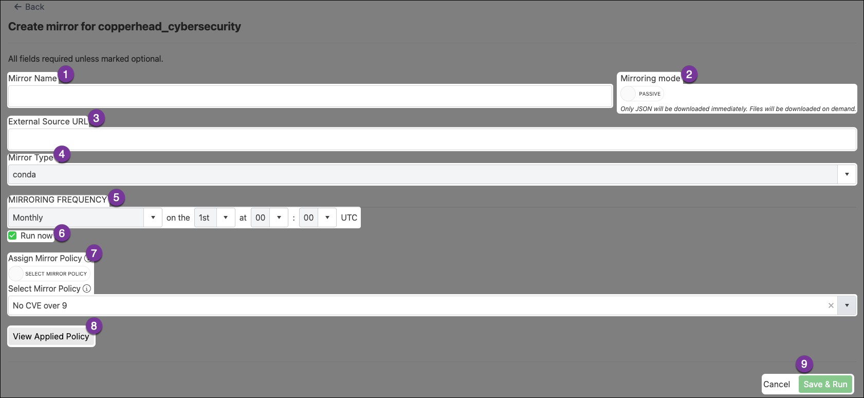 Select Cancel at any time to quit your mirror form completion and discard any set parameters. Select Save & Run to start your mirror.