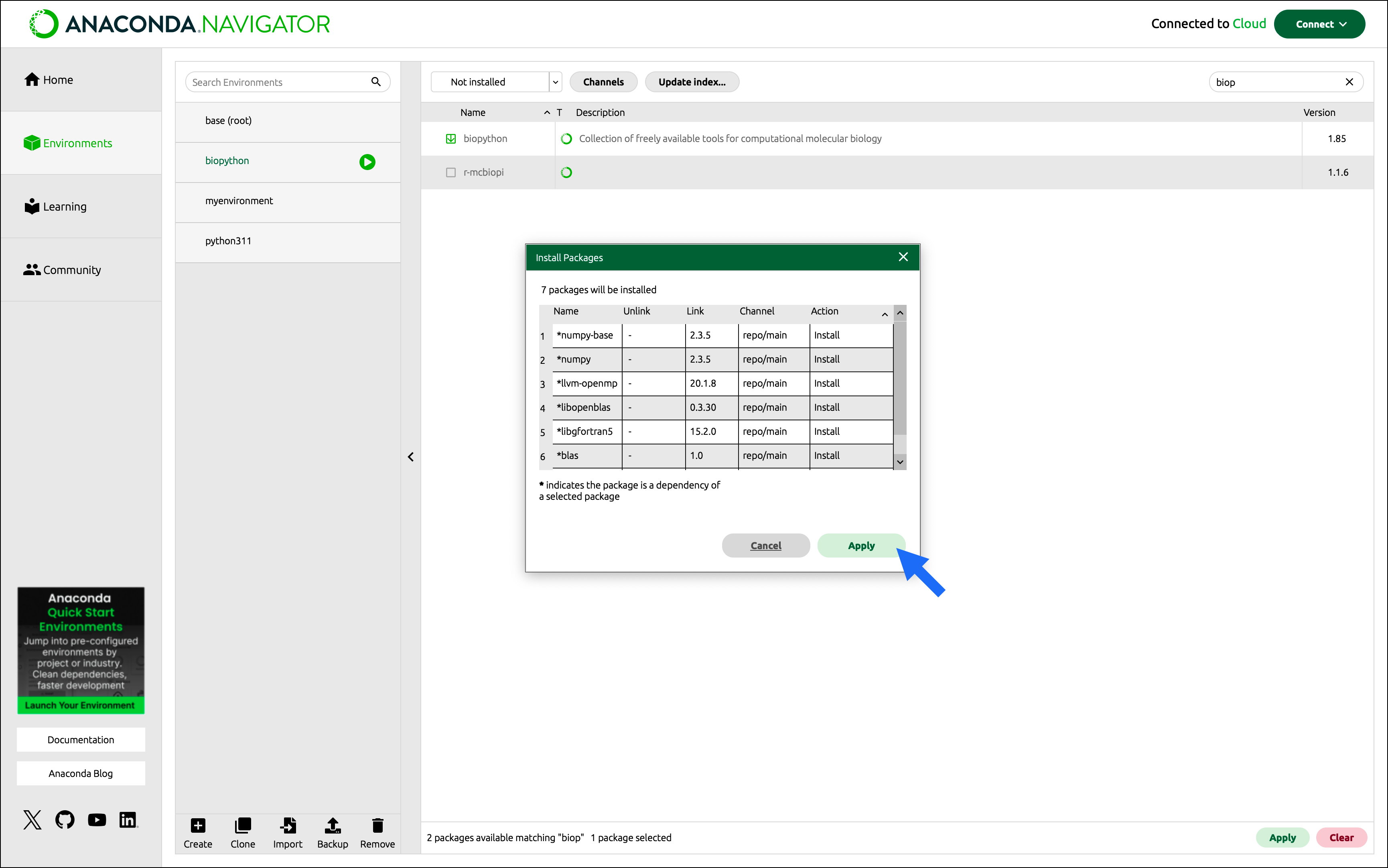 Once a package is installed, it appears in the Installed package list for the given environment, but another way to confirm that a package is installed correctly is by opening a Jupyter Notebook in that environment, importing the package, and displaying its help text. These instructions assume you created an environment namedbiopython and installed the BioPython package into it.