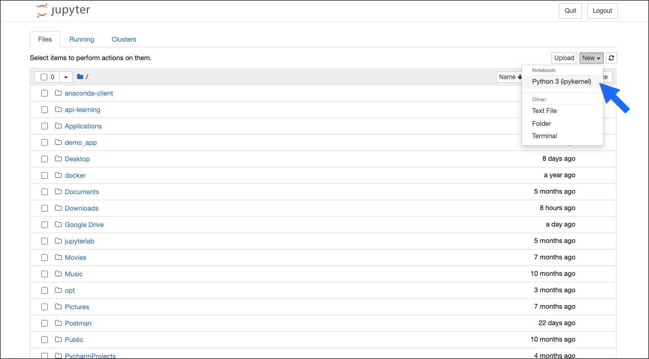 In the Jupyter Notebook, click New and select the Python 3 kernel.