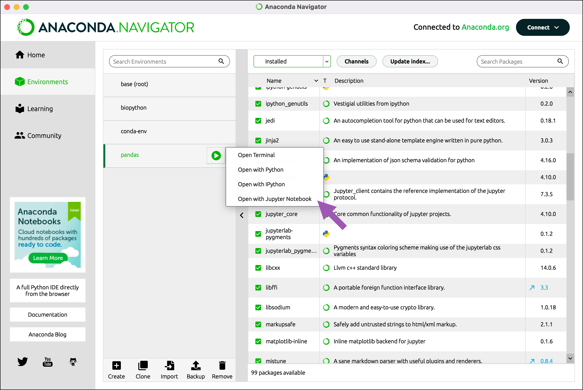 15. In the list that appears, select the tool to use to open Pandas. To access the iPython or Jupyter Notebook tool options, install JupyterLab or Jupyter Notebooks from the Home page.
