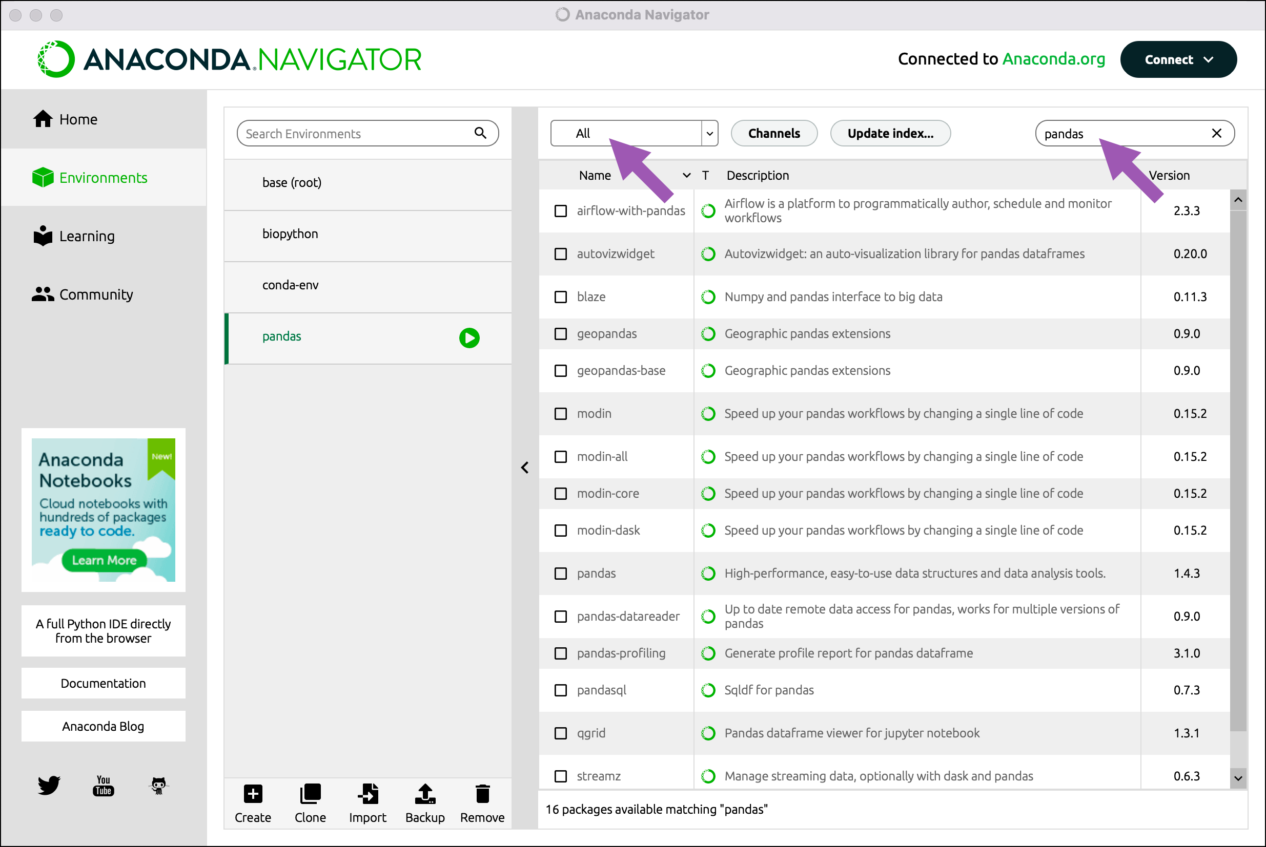 Pandas is a common Python tool for data manipulation and analysis. This topic explains how to use Navigator to set up and begin working with Pandas via your choice of tool: terminal, Python, IPython, or Jupyter Notebook. The steps are similar for installing and opening nearly any .