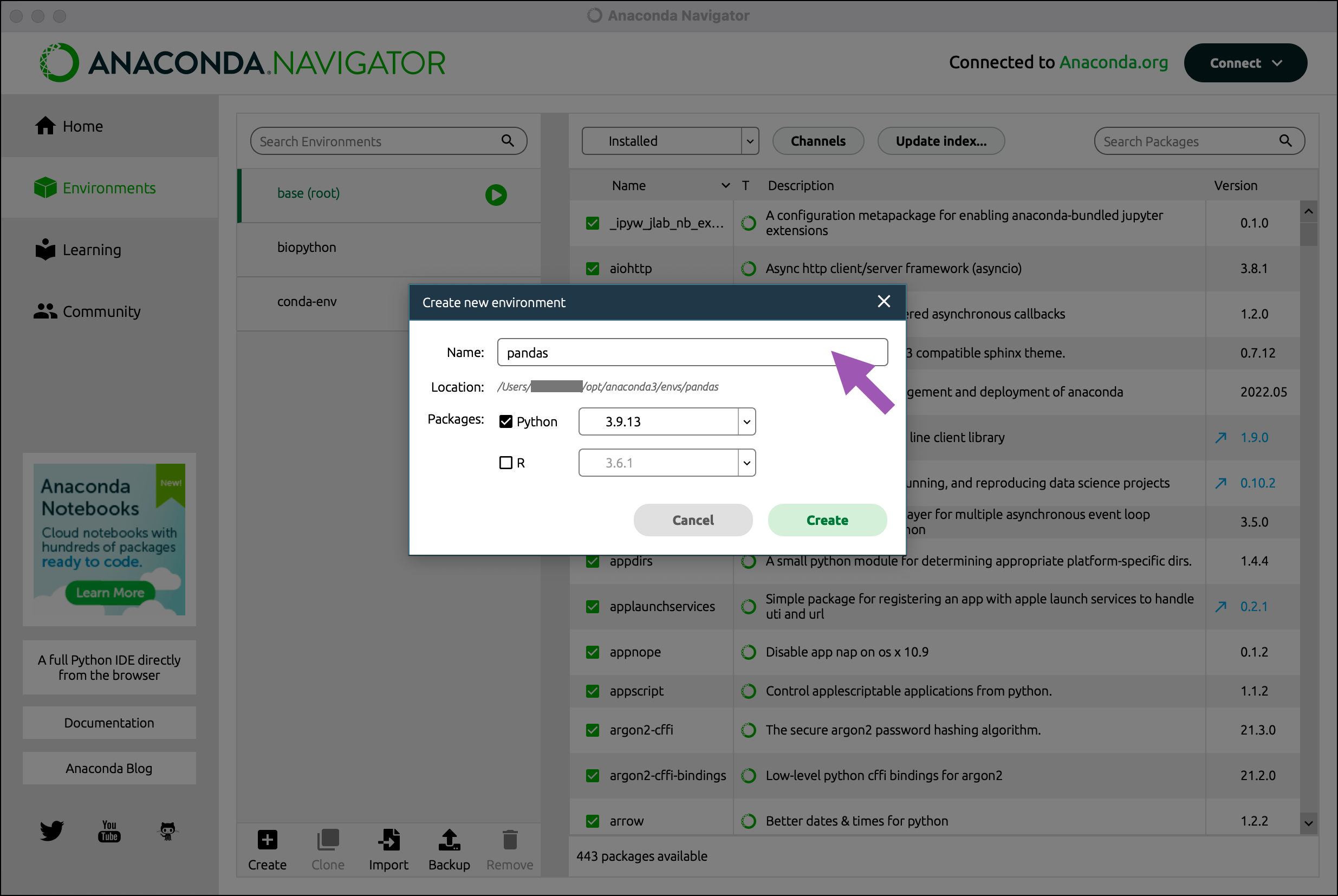 3. Click Create. When prompted, enter a descriptive name for the environment, such as “Pandas”.