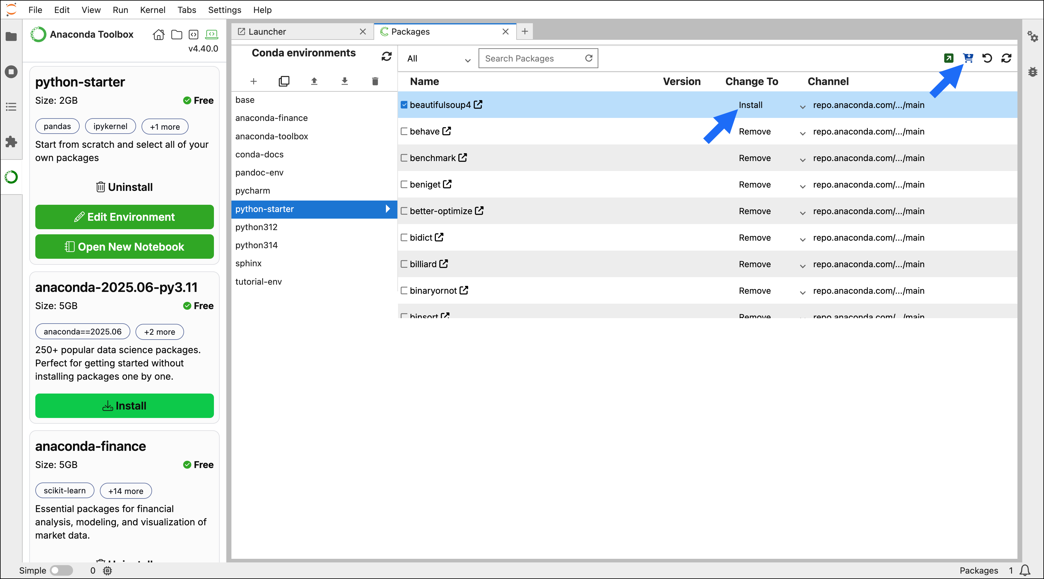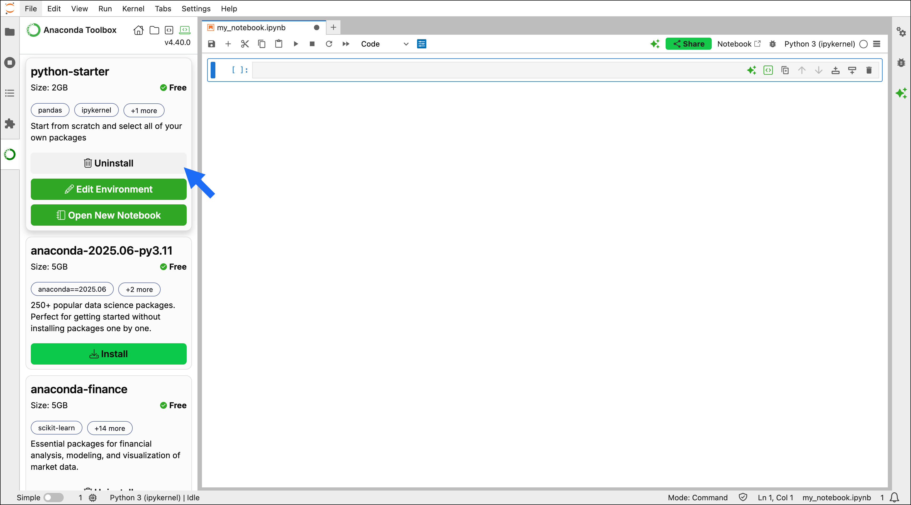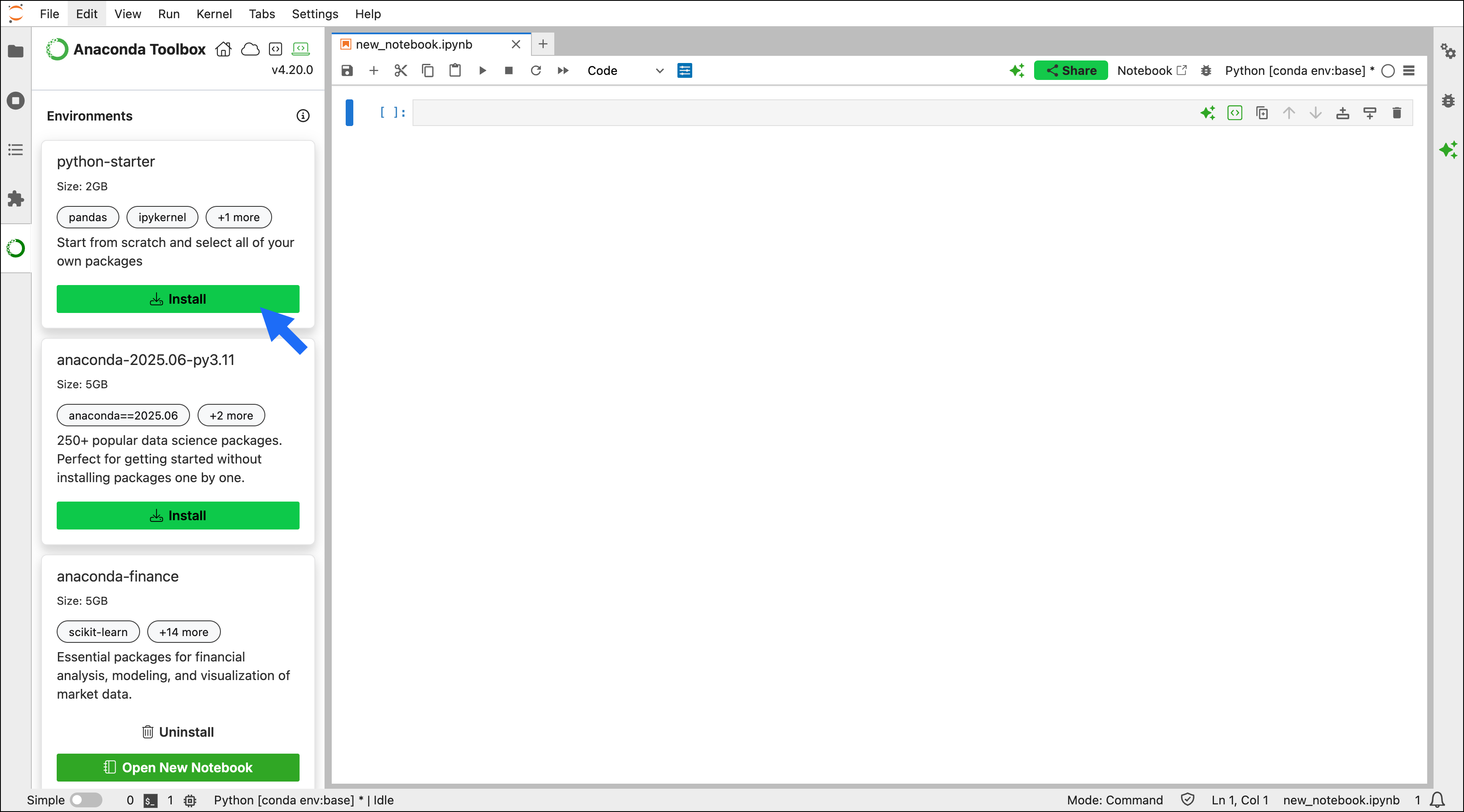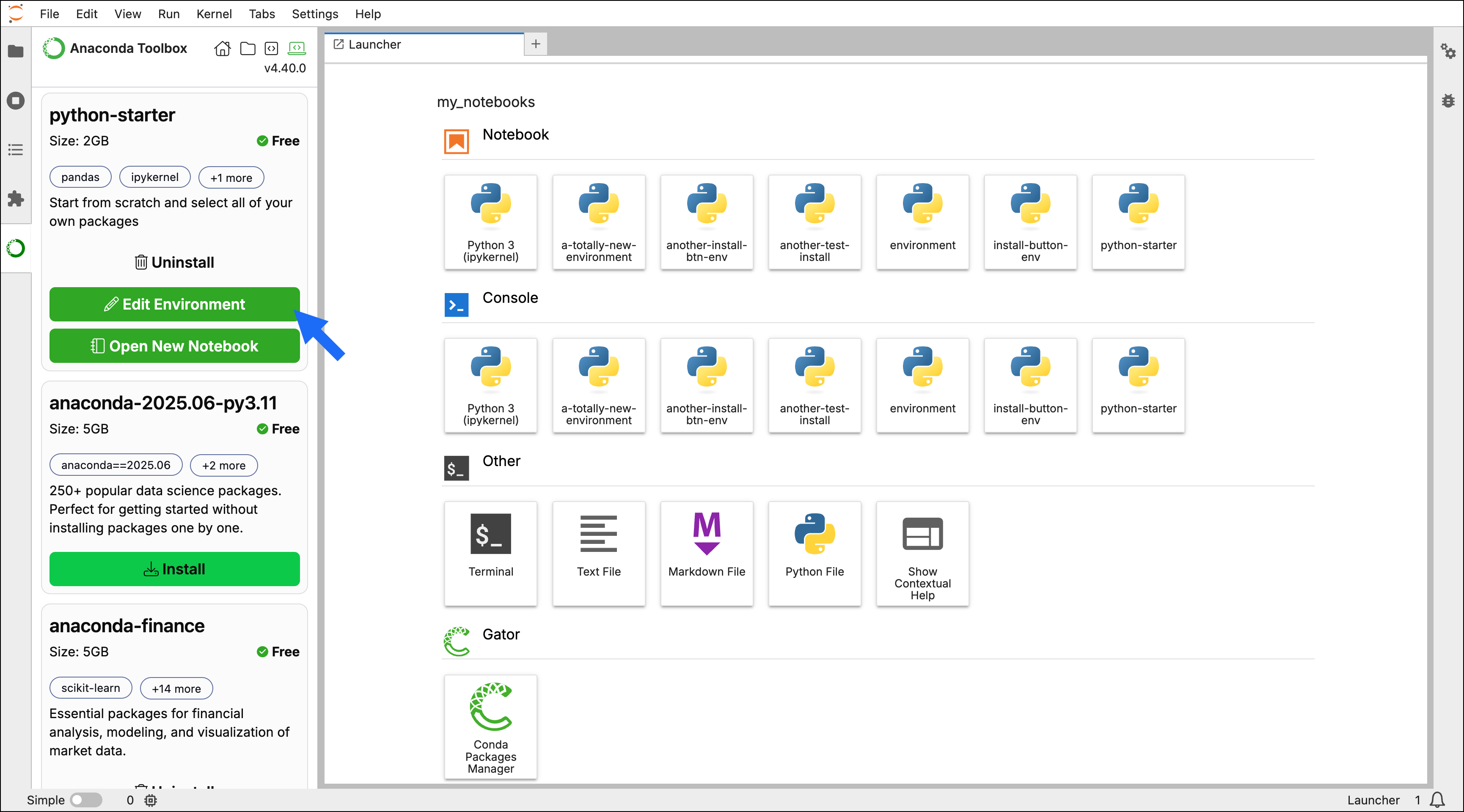The Gator JupyterLab extension is an environment and package management tool that provides a for managing your conda environments. You can use the Gator extension to add, remove, or update packages in an environment. Gator comes bundled with Anaconda Toolbox, so there’s no need to install anything to get started. To edit the packages in a quick start environment:- Select Create a New Environment in Anaconda Toolbox.