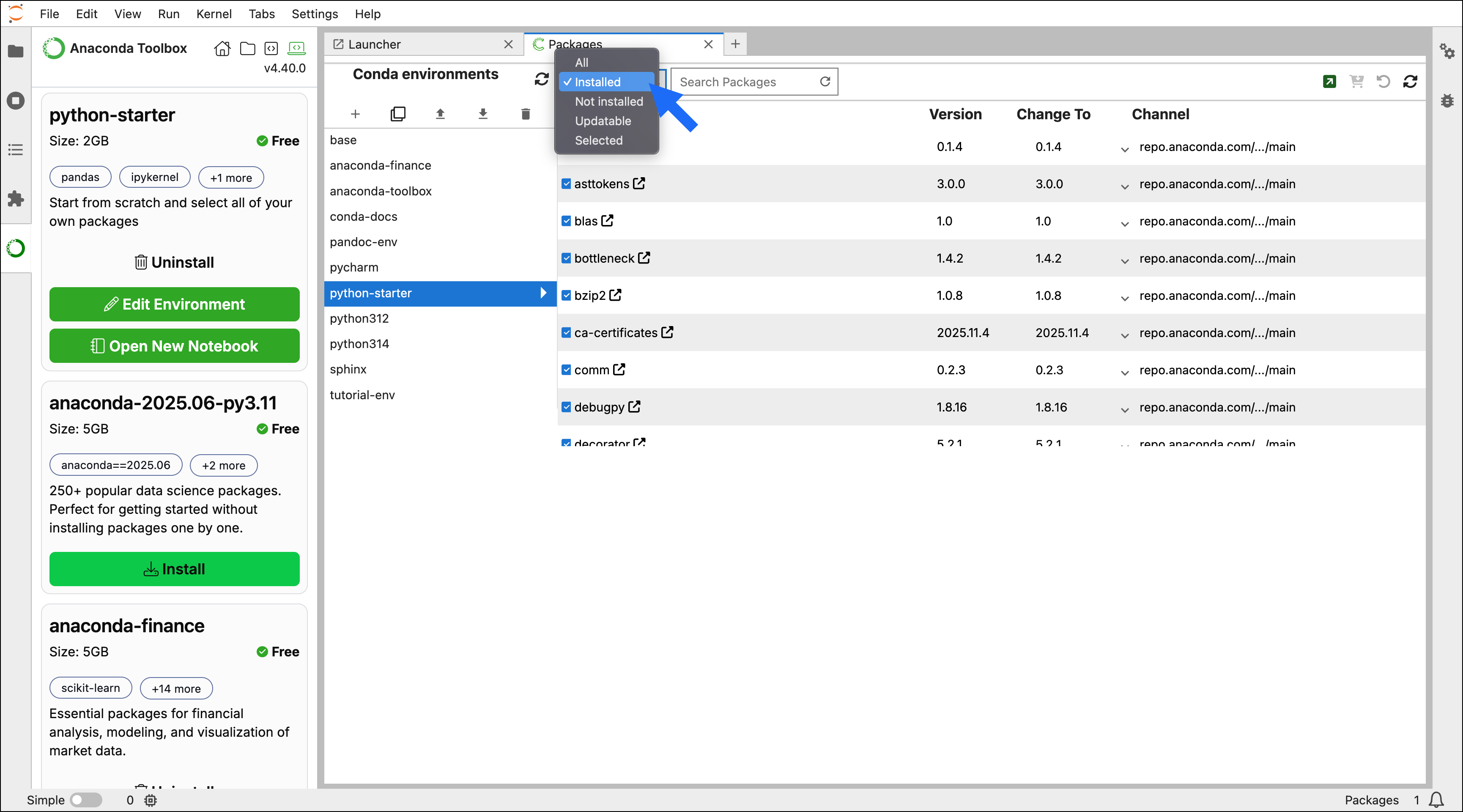Open the filter dropdown menu beside the search bar and select Installed to display the packages that are currently installed in the environment.