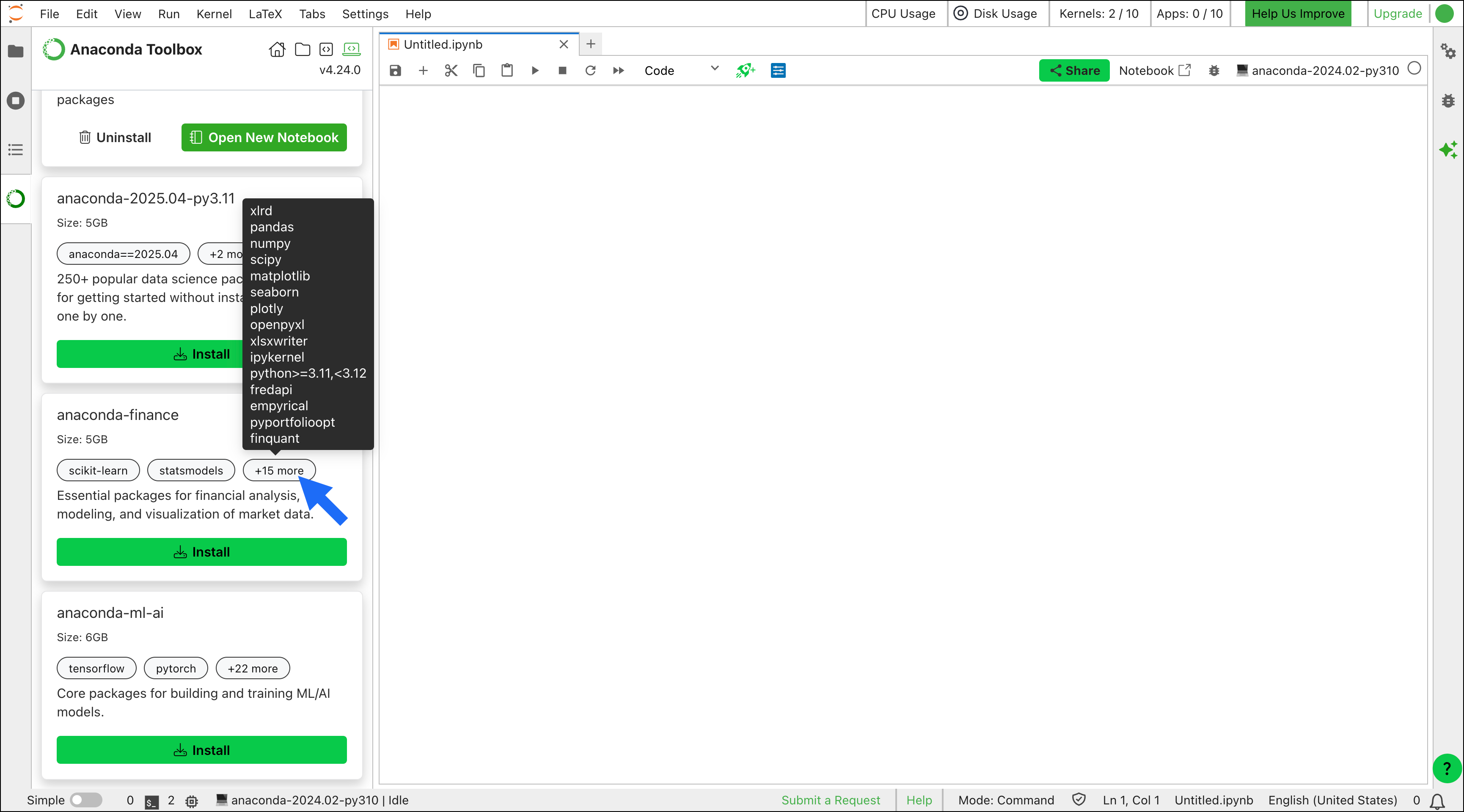 Anaconda Toolbox comes with the following quick start environments ready to be installed and used. Each environment includes curated packages for fields that rely on data analytics, helping you discover new tools to optimize workflows and ensuring teams work with identical configurations for seamless collaboration.Quick start environment subscription tiers