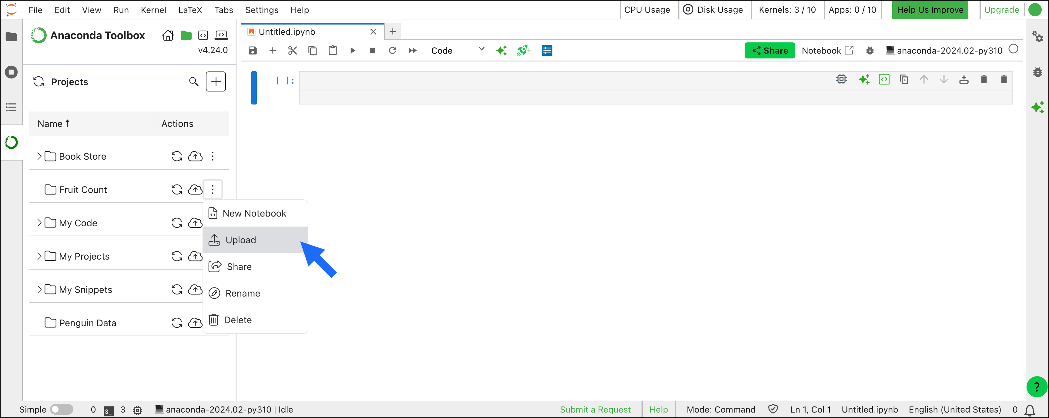 - Upload files to your project, or transfer files already saved in Anaconda’s cloud storage.