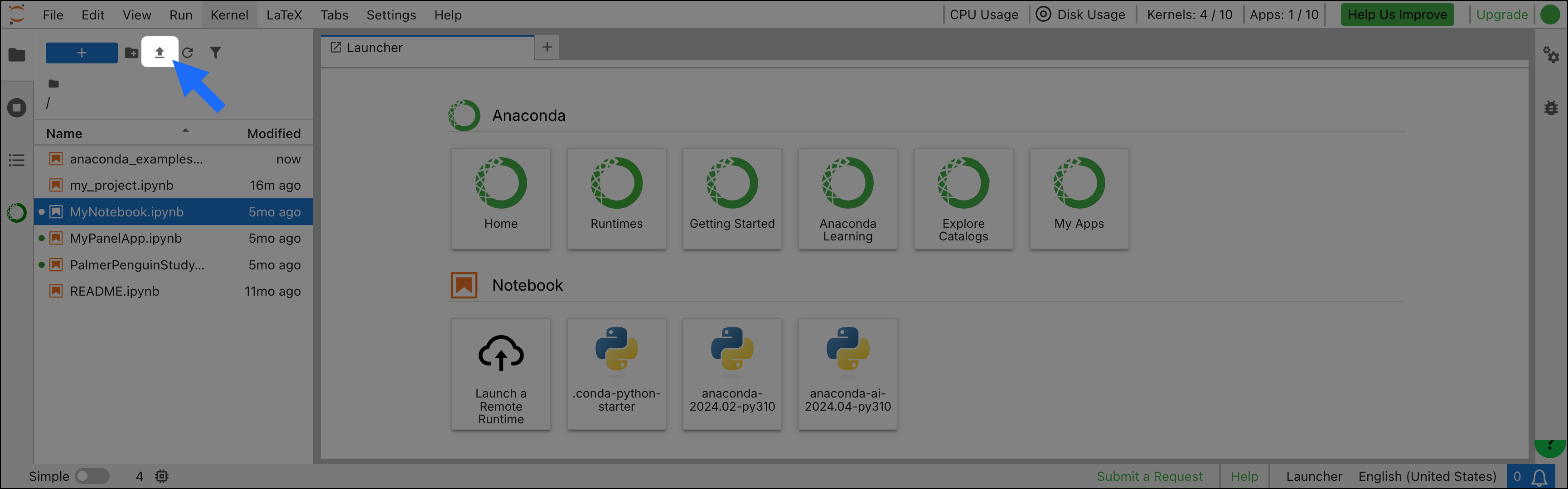 In the Anaconda Notebooks JupyterLab interface, click Upload files in the File Browser to browse for a local.ipynb file. Then, click Open. The notebook will appear in the left-hand menu.