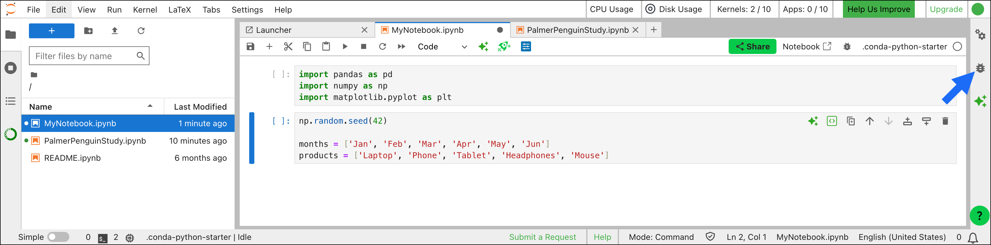 To activate the debugger, click the bug icon to the right of your active notebook. Learn more about the debugger from JupyterLab’s Debugger topic.