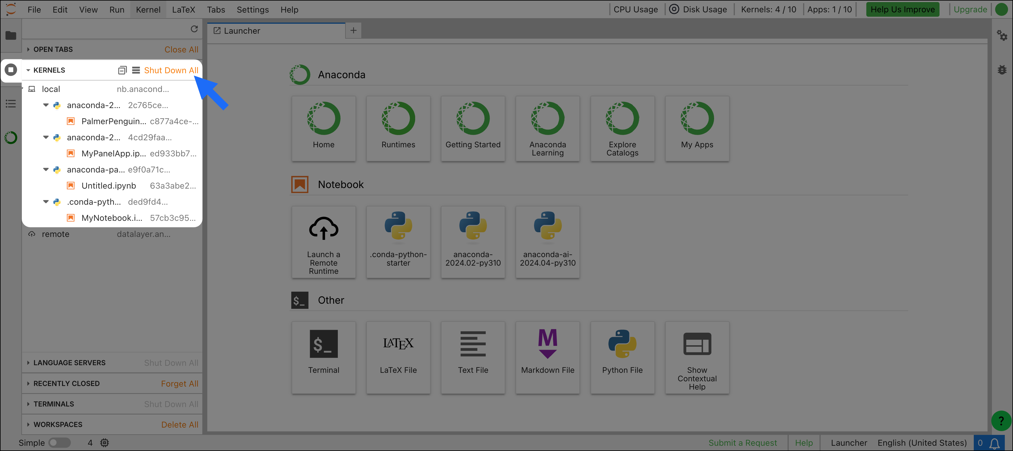 To completely reset (“factory reset”) your instance of Anaconda Notebooks, click anywhere on the Disk Usage meter to open the Manage Disk Usage dialog. Then, click Reset…. See our Data storage and memory topic for further details.I opened Anaconda Notebooks for the first time today and all my CPU seconds have been used up.