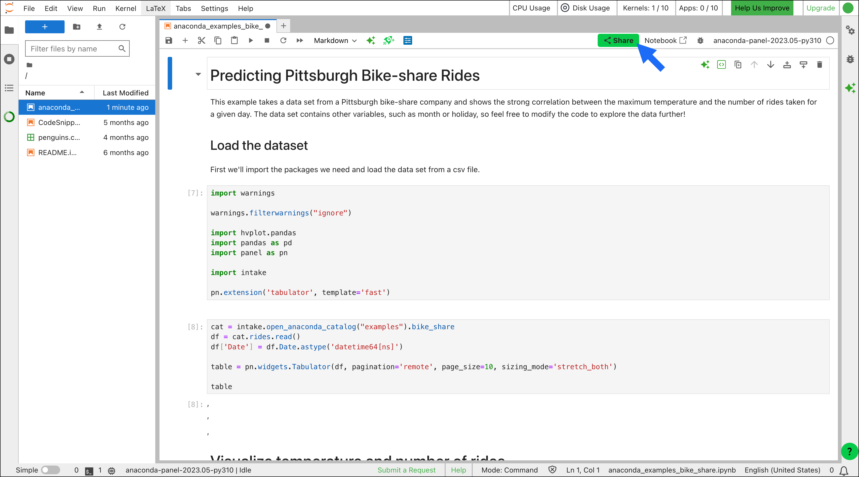 Using a consistent and recognizable style, badges are clickable tiles that provide direct access to a notebook. Add these badges to websites, blog posts, documentation, GitHub repositories, or social media posts so anyone can open your notebook in a new instance of Anaconda Notebooks. Badges can be created directly in Anaconda Notebooks by clicking Share at the top of your notebook, as shown in the following section. This provides you with HTML for a badge, which can be copied and embedded anywhere. You can also generate a badge for notebooks hosted on GitHub and many other sites using this badge creator. For GitHub, use the Raw button to get a URL starting withraw.githubusercontent.com.