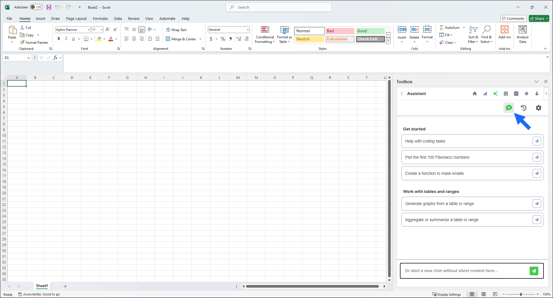 - Once the Assistant has provided the code, click the Placement in Workbook cell and select a cell in your workbook to render the code.
