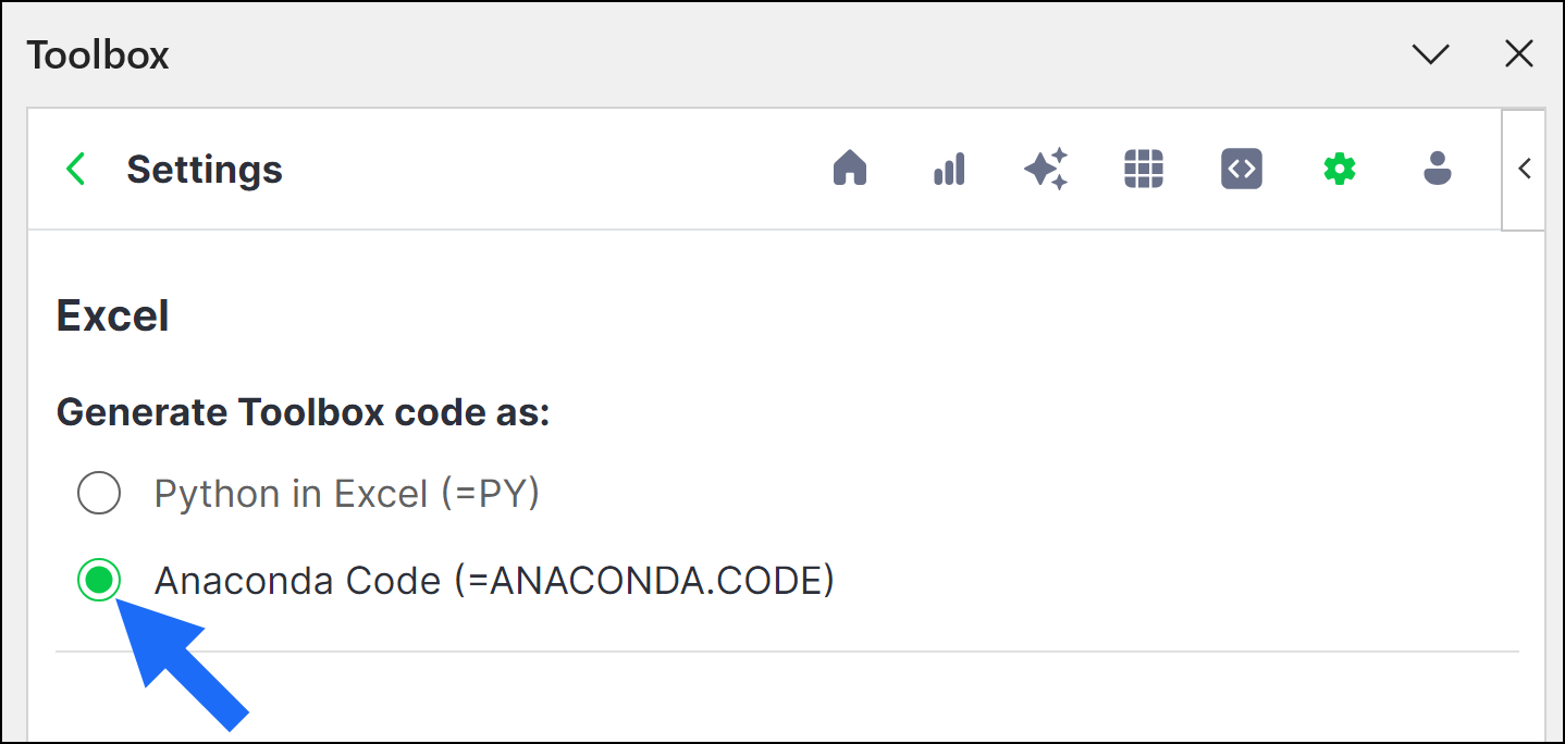 If another user shares a project with you, or if you’ve uploaded a dataset in another workbook or Anaconda Notebook, download appears beside that dataset. Datasets can be downloaded as either an Excel range reference or as an Anaconda Code object.- Excel Range